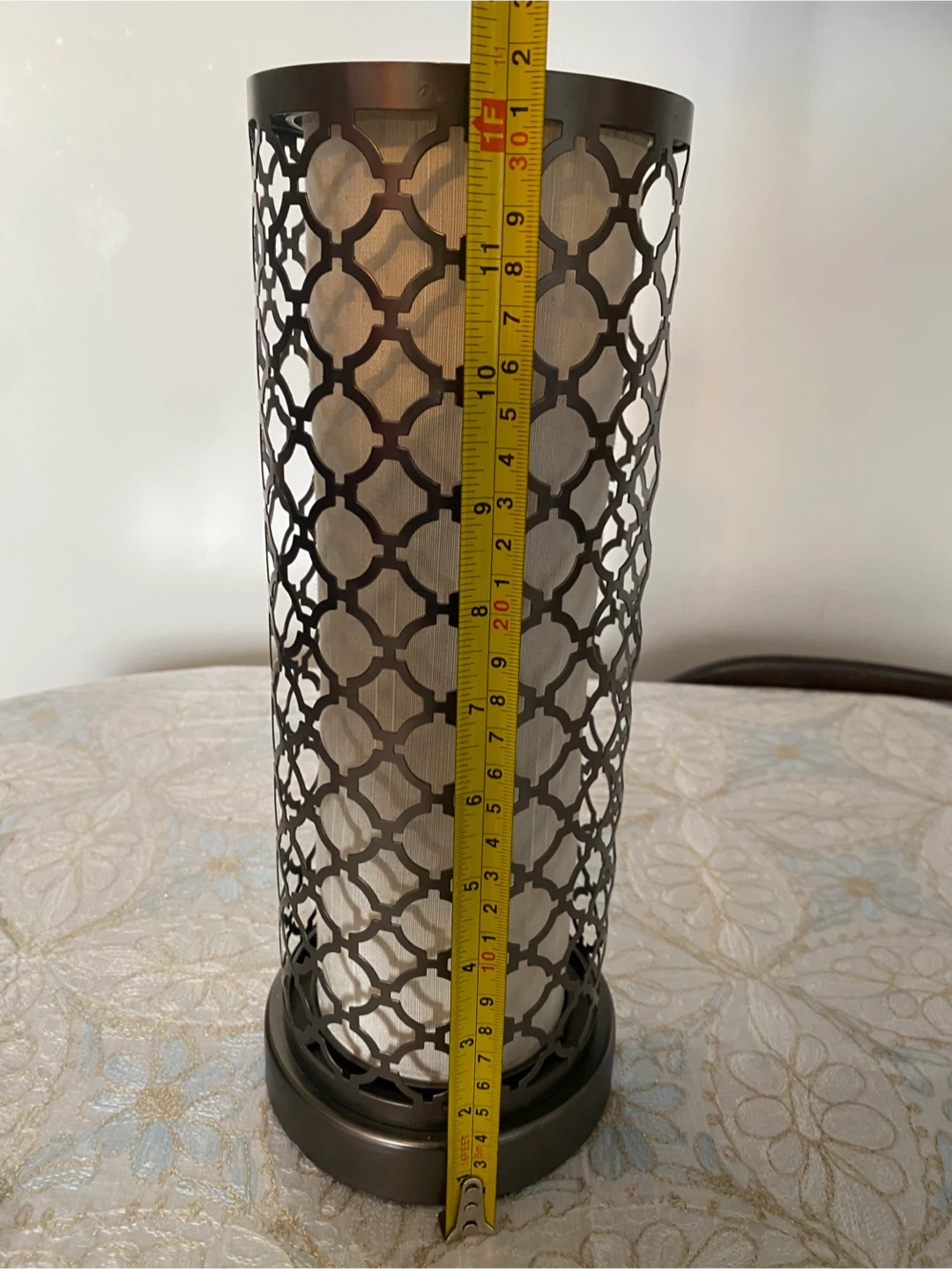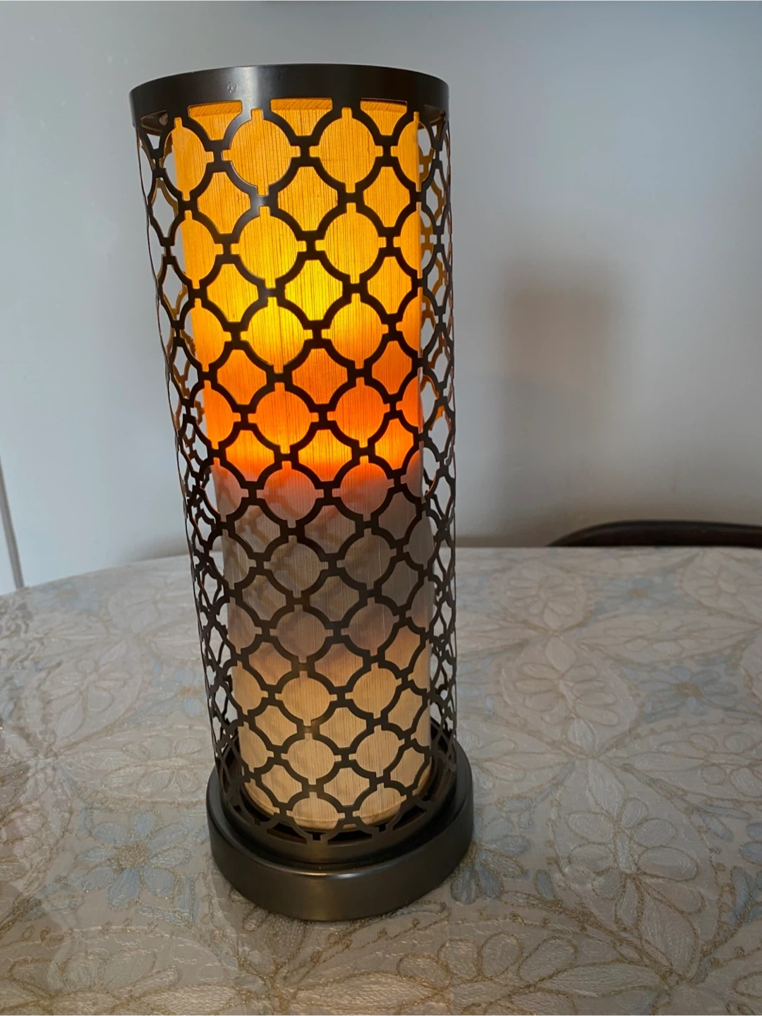 This is a Bouclair table lamp that adds a warm glow to any room. It features a metal cage design with a fabric inner shade. The lamp stands approximately 12 inches tall Perfect for a bedside table or living room accent. Pick up in Gloucester