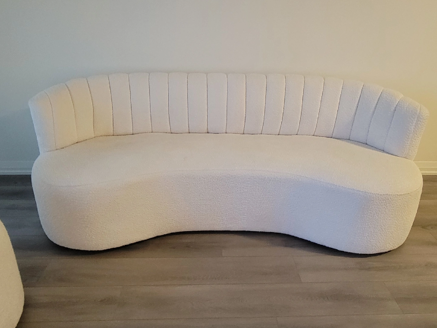 Looking to add a touch of cozy to your space? This adorable boucle accent chair is perfect! It's in great condition and the cream white colour will match any decor. The soft boucle material makes it super comfy for lounging. Add a touch of elegance to your living room or bedroom with this stylish piece