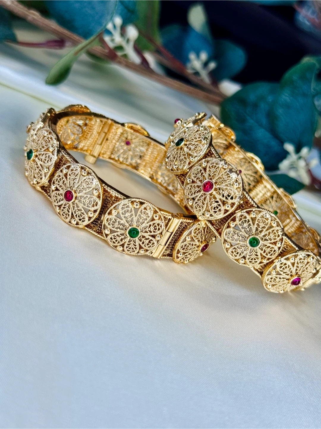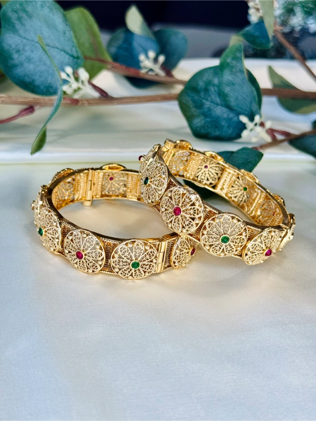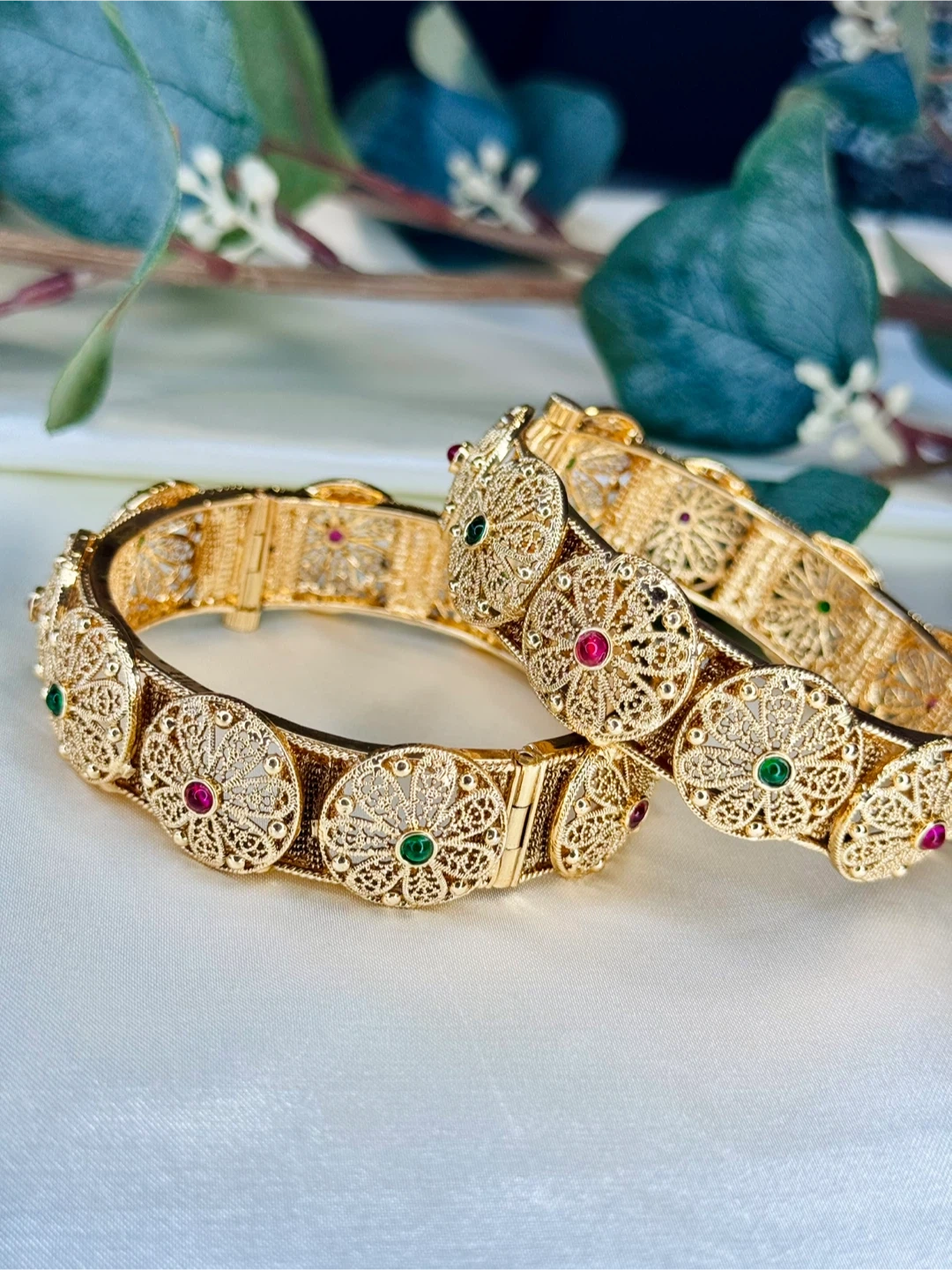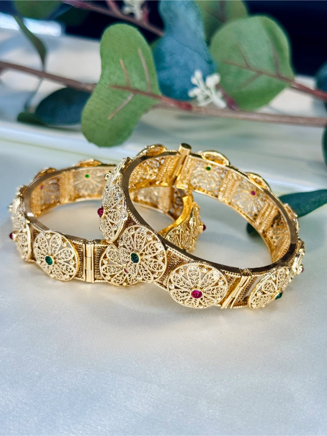 A pair of intricately designed gold tone bangles. Each bangle features a delicate filigree pattern embellished with small red and green stones. They're secured with a clasp mechanism.