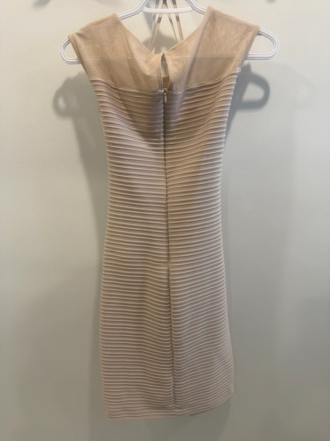 Apricot colour dress with a detailed beaded neckline. It features a flattering ruched texture throughout the fabric. Includes a back zipper closure.