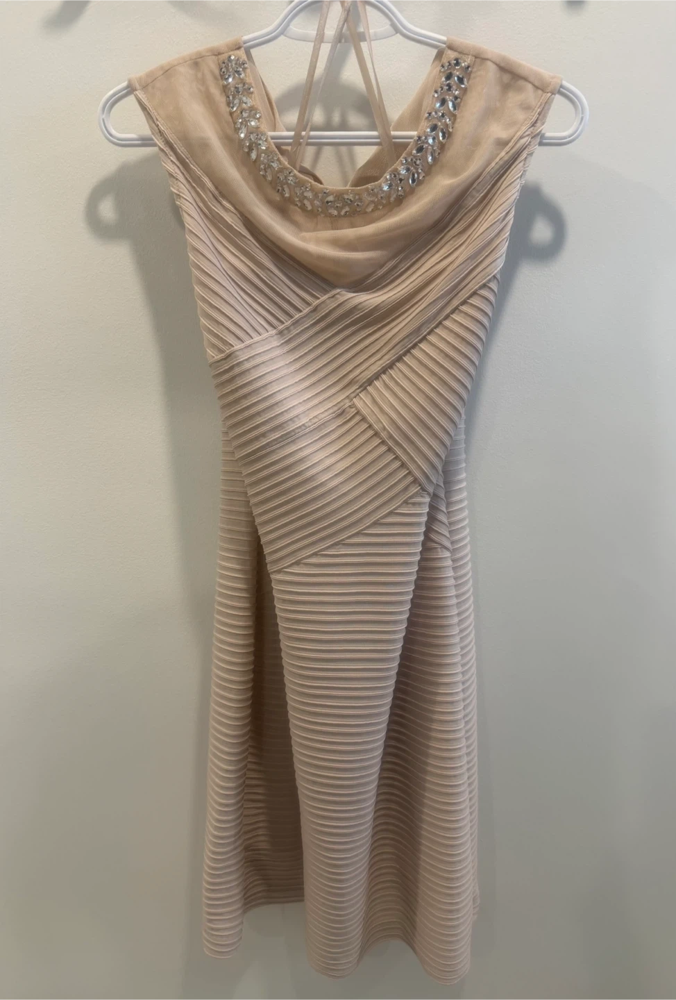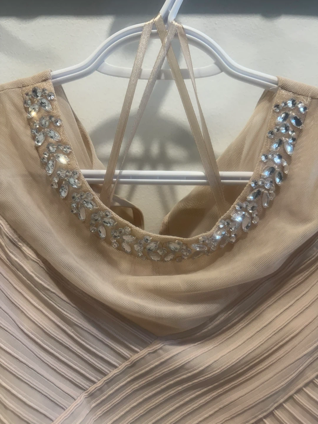 Apricot colour dress with a detailed beaded neckline. It features a flattering ruched texture throughout the fabric. Includes a back zipper closure.