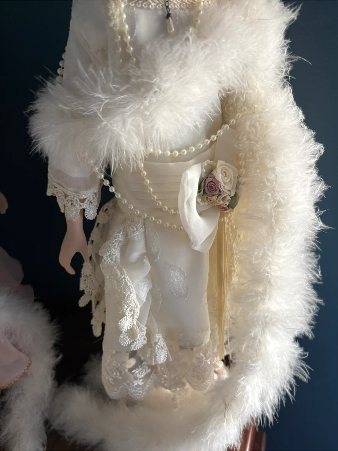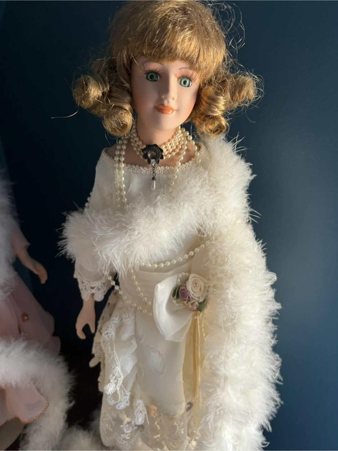 This is a beautiful porcelain doll dressed in an elegant white gown with a faux fur stole. It features intricate lace detailing and pearl accessories. This doll would make a lovely display piece.