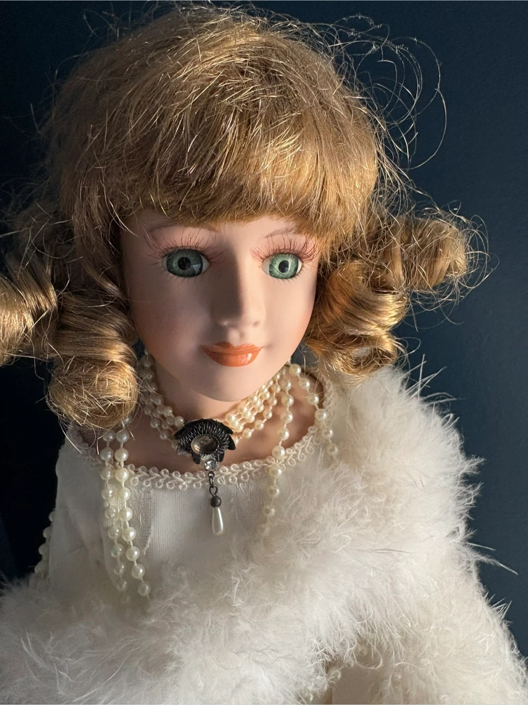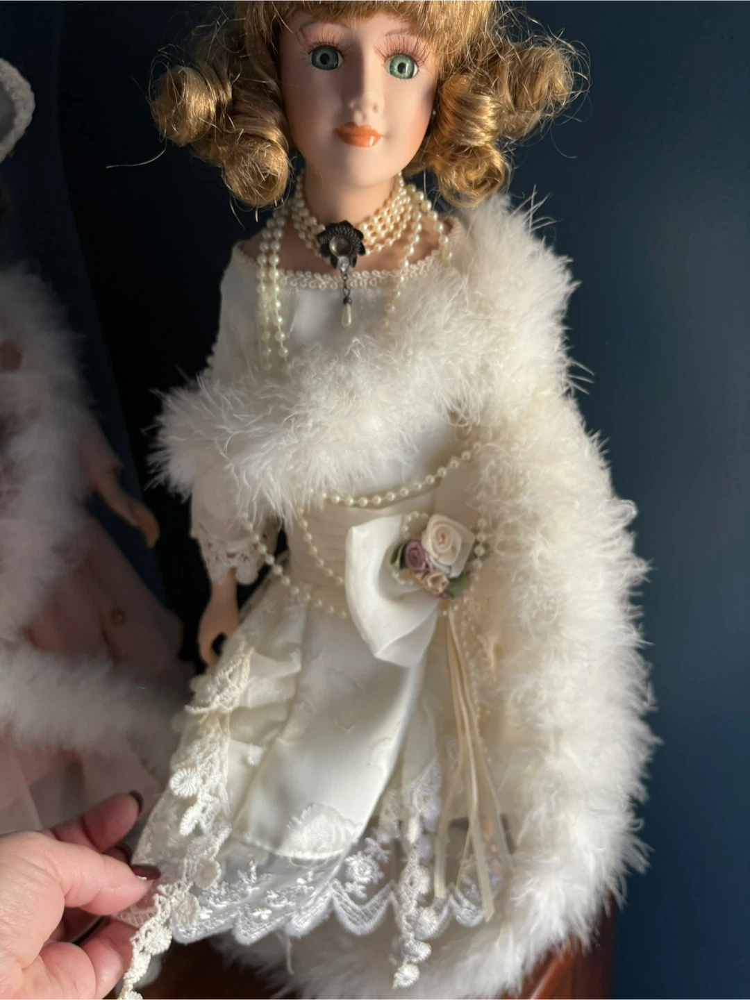 This is a beautiful porcelain doll dressed in an elegant white gown with a faux fur stole. It features intricate lace detailing and pearl accessories. This doll would make a lovely display piece.