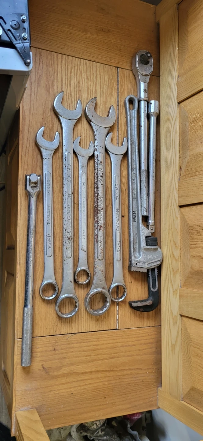 This set includes several Westward wrenches with sizes ranging from 1-5/16" to 1-1/2". It also comes with a ratchet and extension. Tools show some signs of wear and rust from regular use. A pipe wrench is also included.Also 1 3/4 and 1 7/8