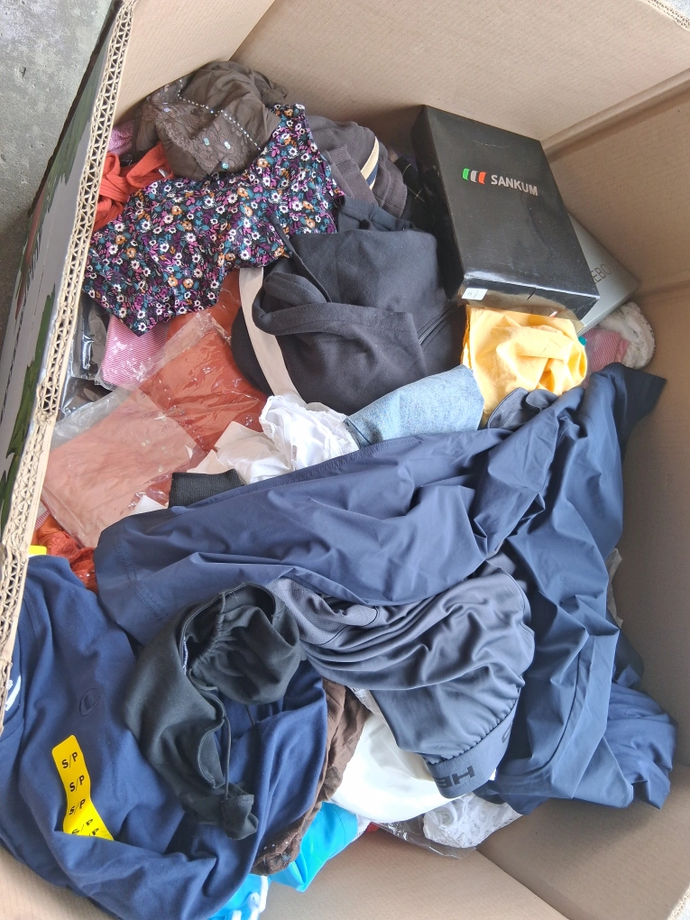 I have a box of mixed clothing for sale. It includes various items, sizes, and styles. Perfect for someone looking for a variety of options!