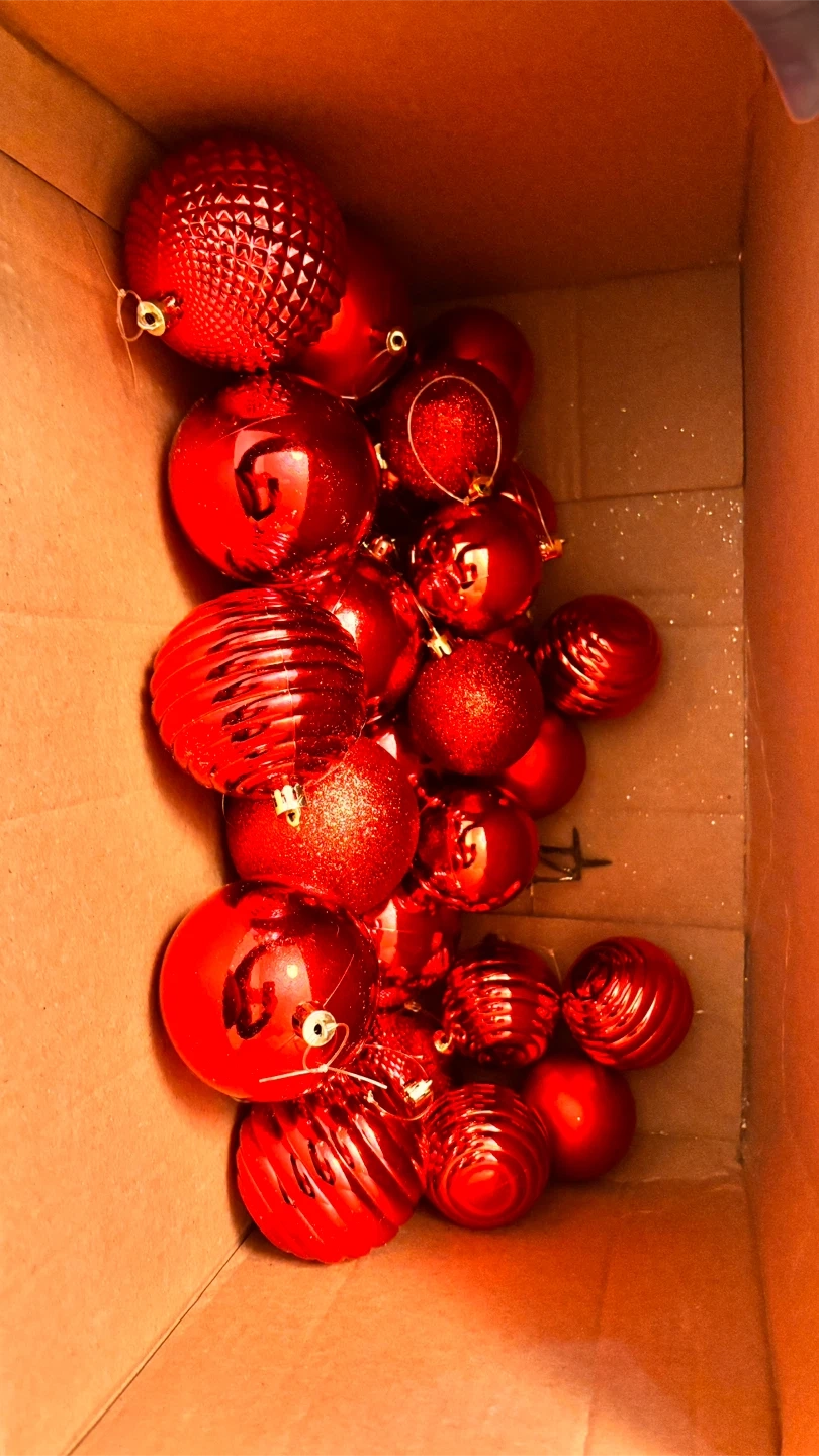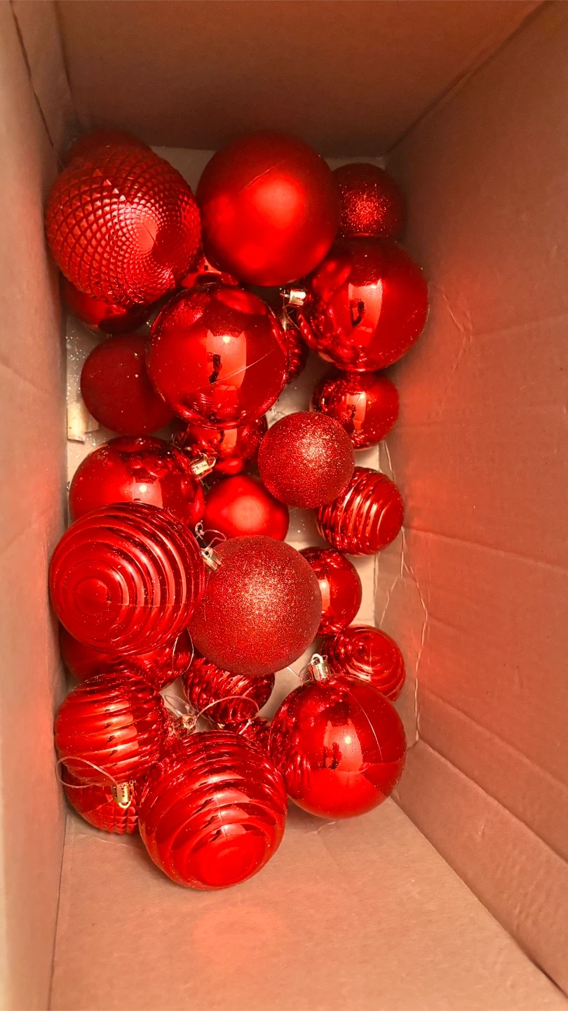 810Selling a box full of red Christmas ornaments! They come in a variety of textures and sizes, perfect for adding some festive cheer to your tree