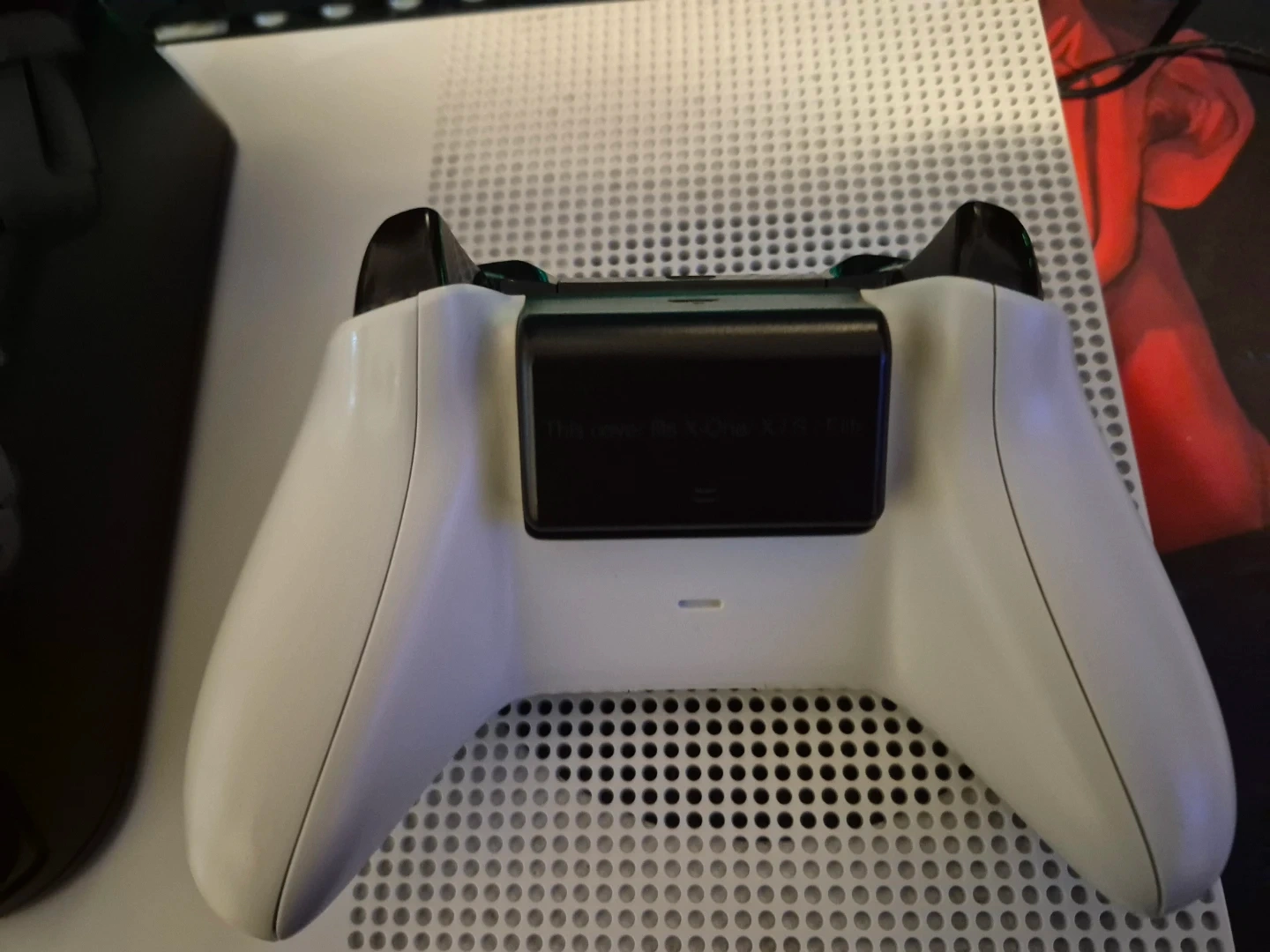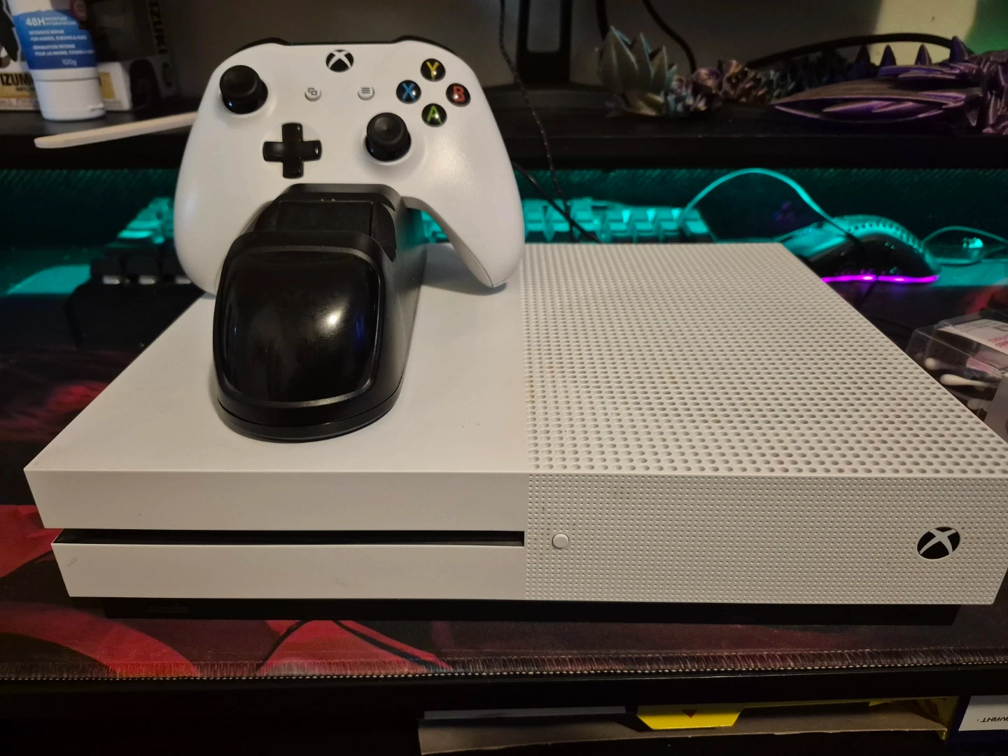 White Xbox One S console and a white wireless controller. Includes a black dual controller charging dock with USB cable. Everything's in good condition!