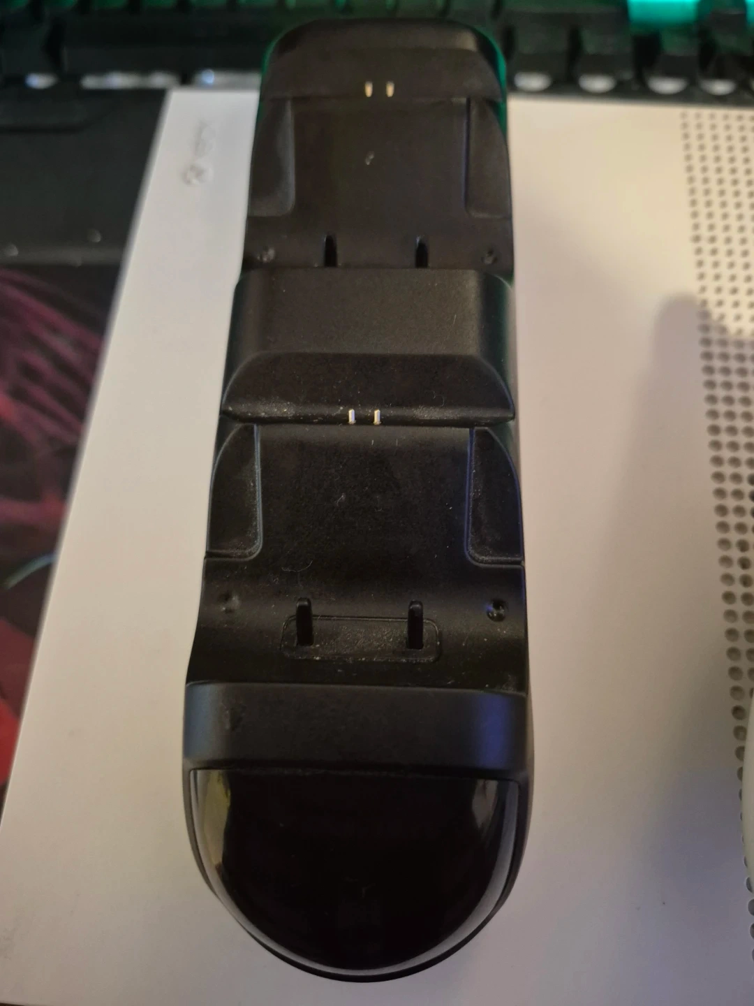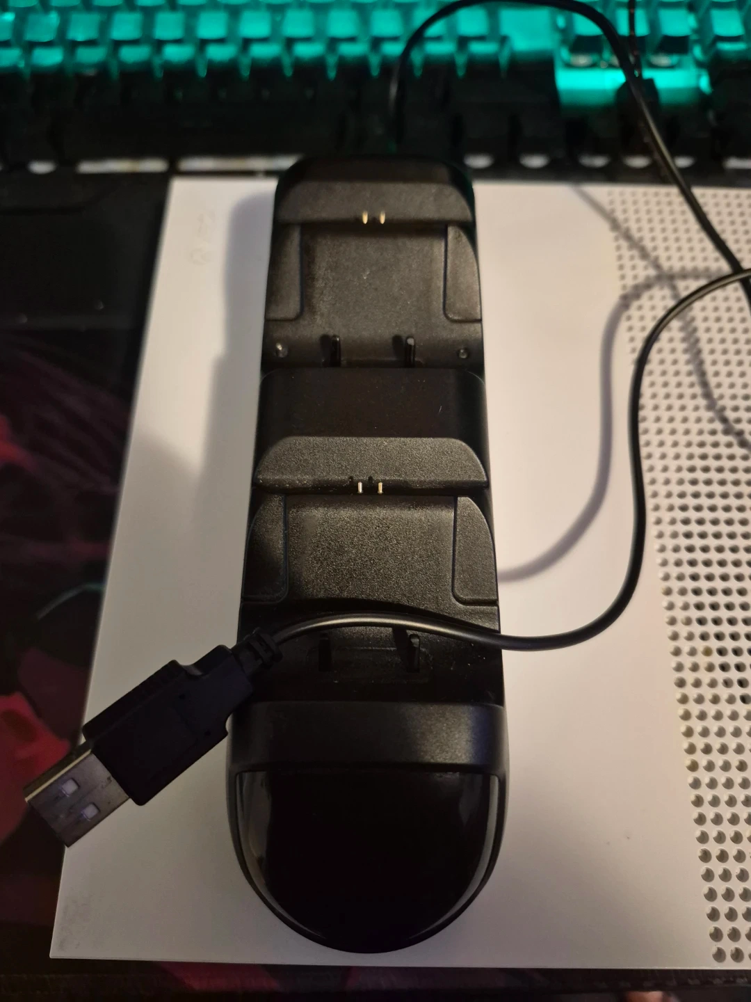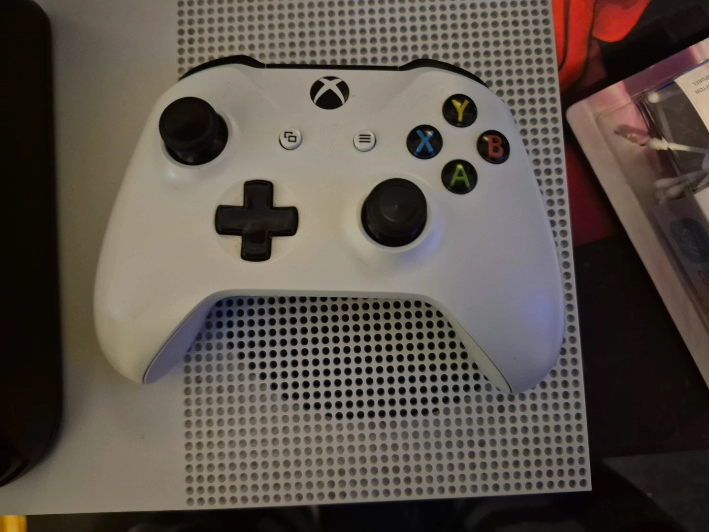 White Xbox One S console and a white wireless controller. Includes a black dual controller charging dock with USB cable. Everything's in good condition!