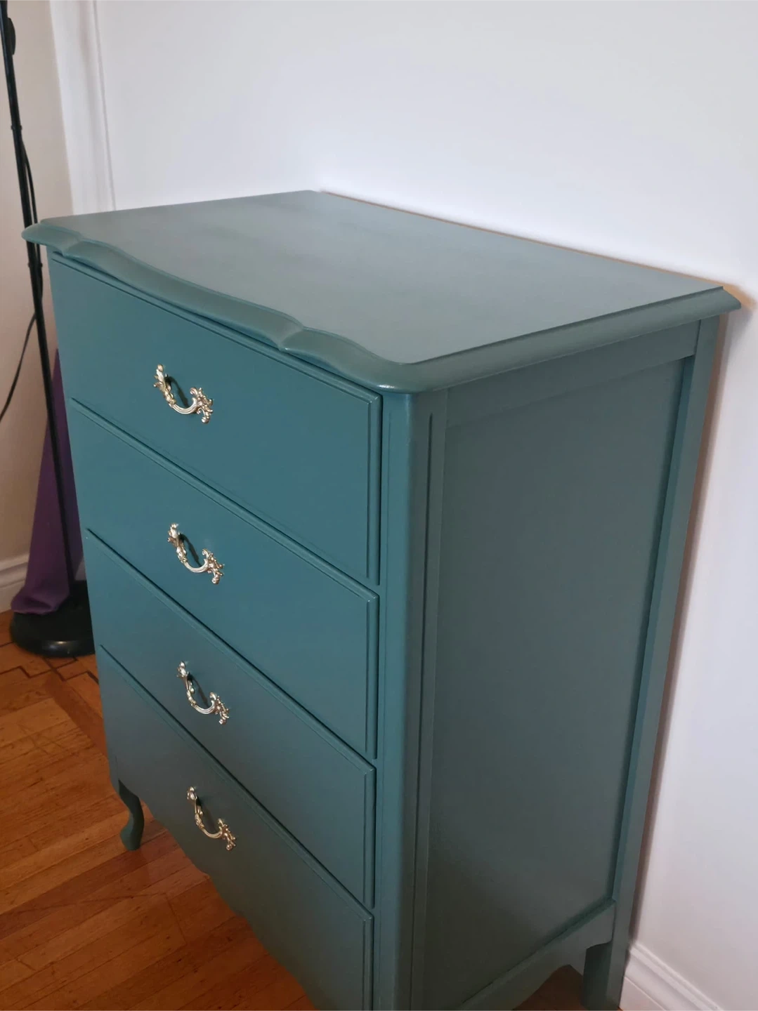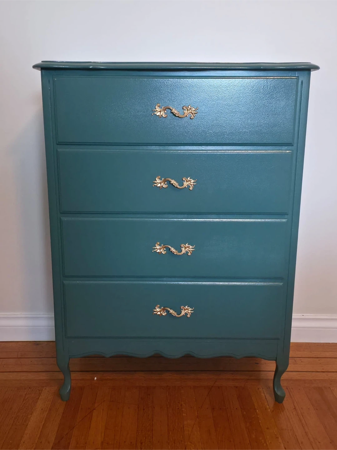 Refinished dresser features four drawers with ornate gold-coloured handles. It's painted in a lovely teal shade and has a decorative scalloped base. Great for bedrooms or as storage in any room!