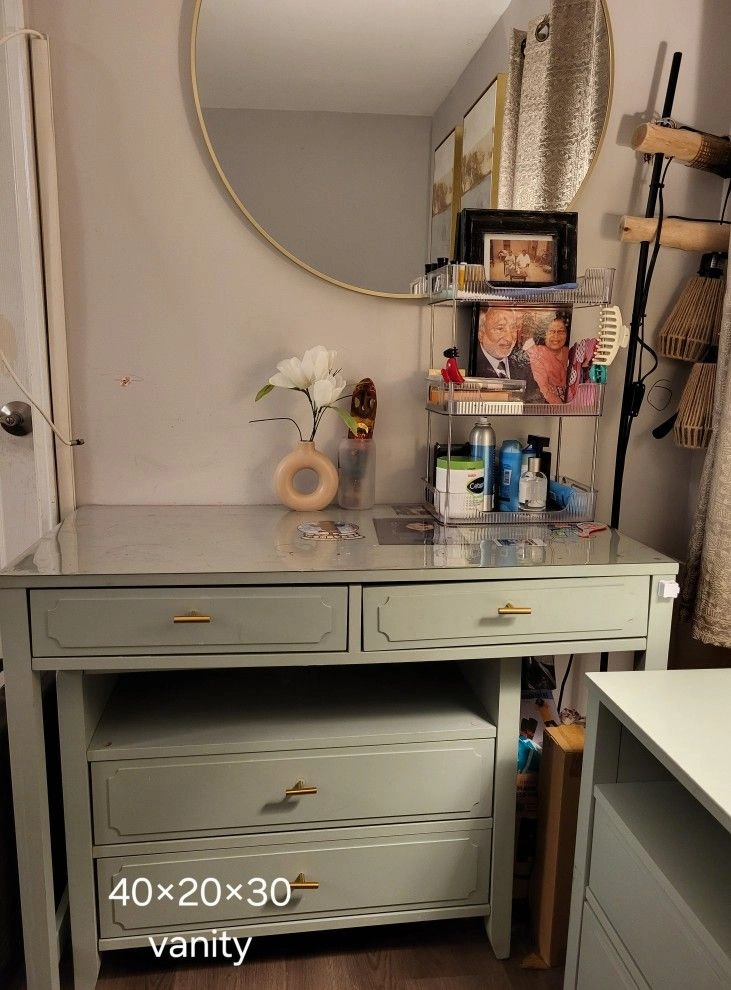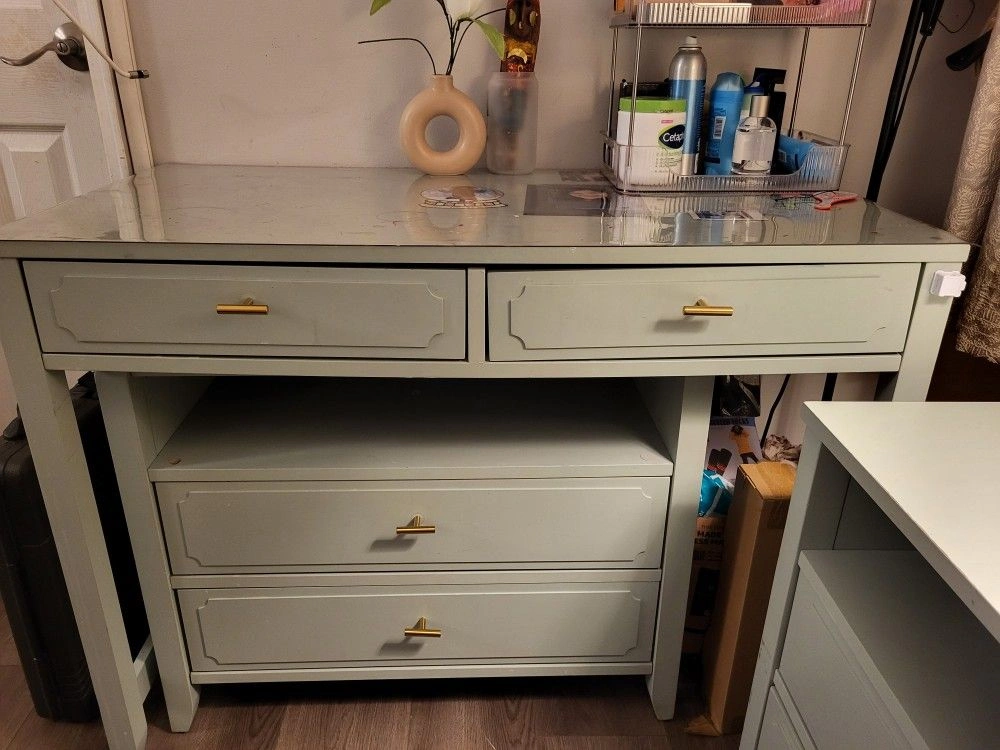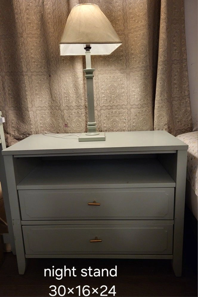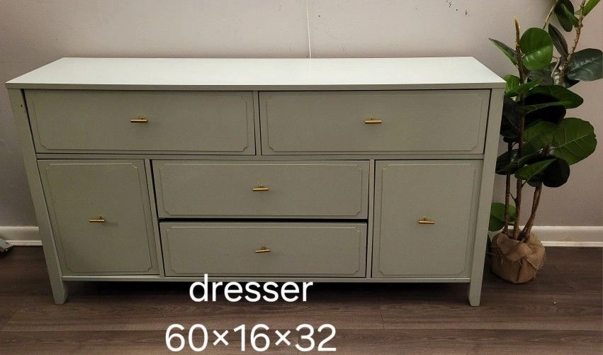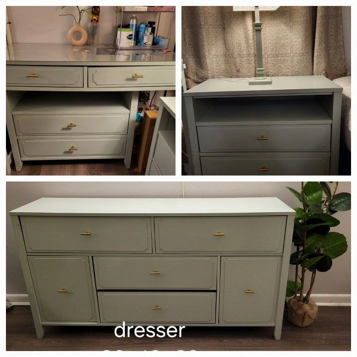 Great modern sage green bedroom set includes one dresser, one vanity, and 2 night stands. Very few unnoticeable pencil marks. No chips, no scratches, almost new. Original price of this set is $5000 plus tax but I am selling at $800 only. I have 2 lamps matching this set which I will give for free (shown in pic). I also have 2 beautiful abstracts original price $500 but I can sell those matching abstracts in $100. Very beautiful and elegant set up. It adds the value to the room.