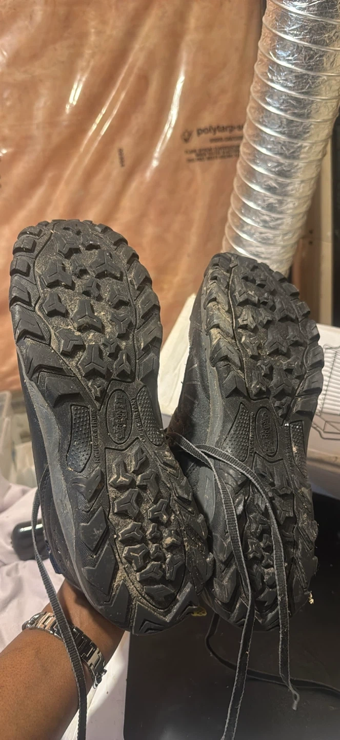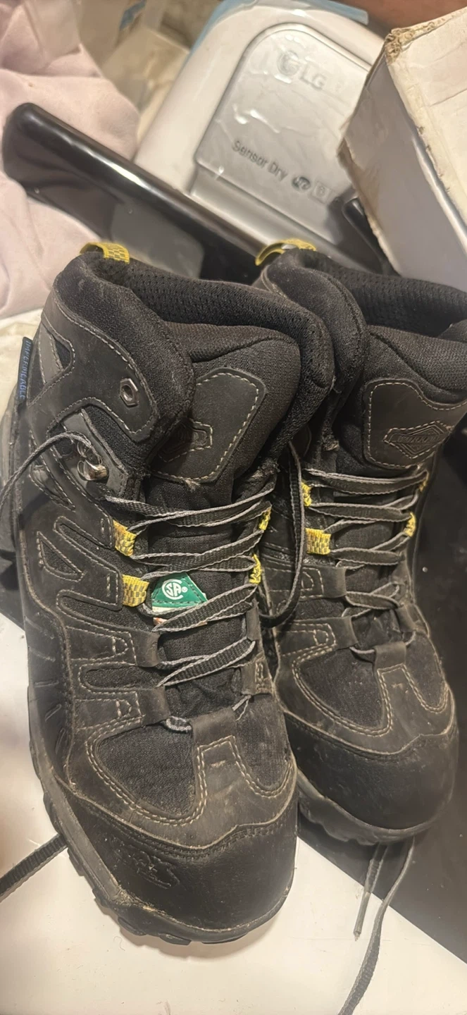 Black work boots with yellow laces and a sturdy sole. Good traction for various terrains. Ready for your next job or outdoor adventure!