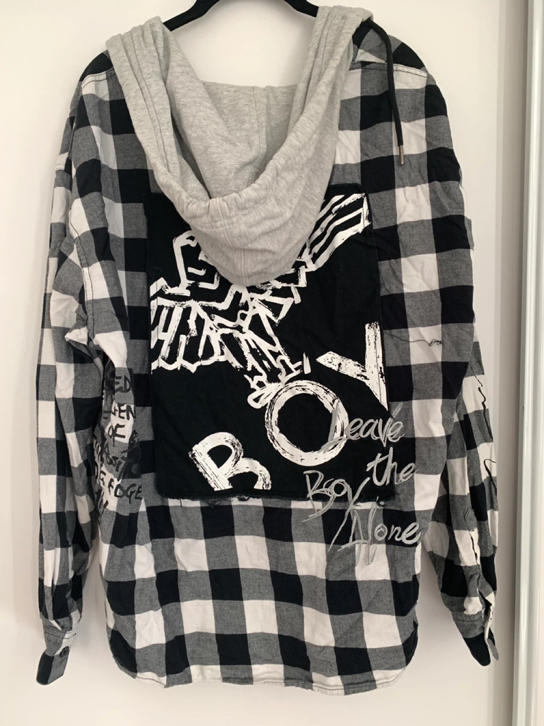 Selling a Boy London checkered flannel hoodie. It's black and white with a grey hoodie. Size is M. Has some cool designs on the back!