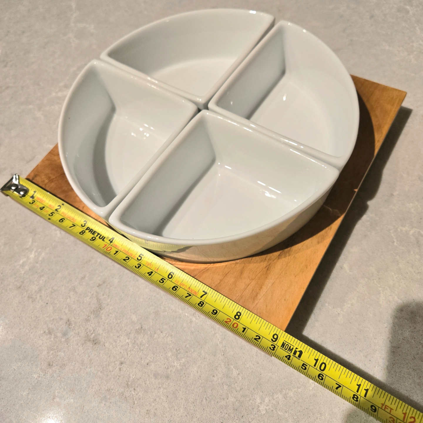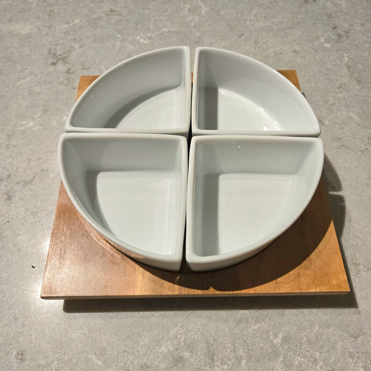 Four-sectioned porcelain appetizer dish with wooden base