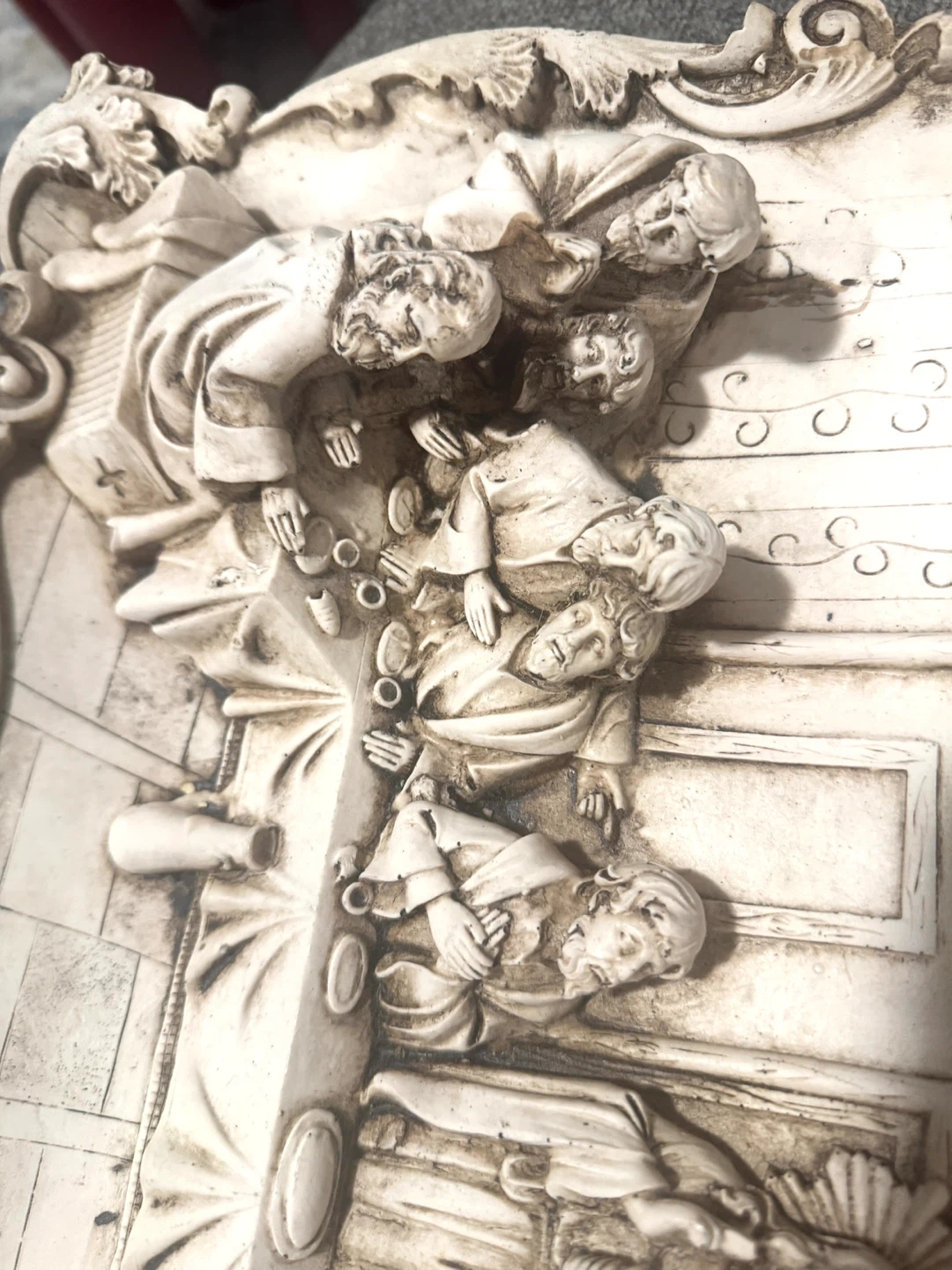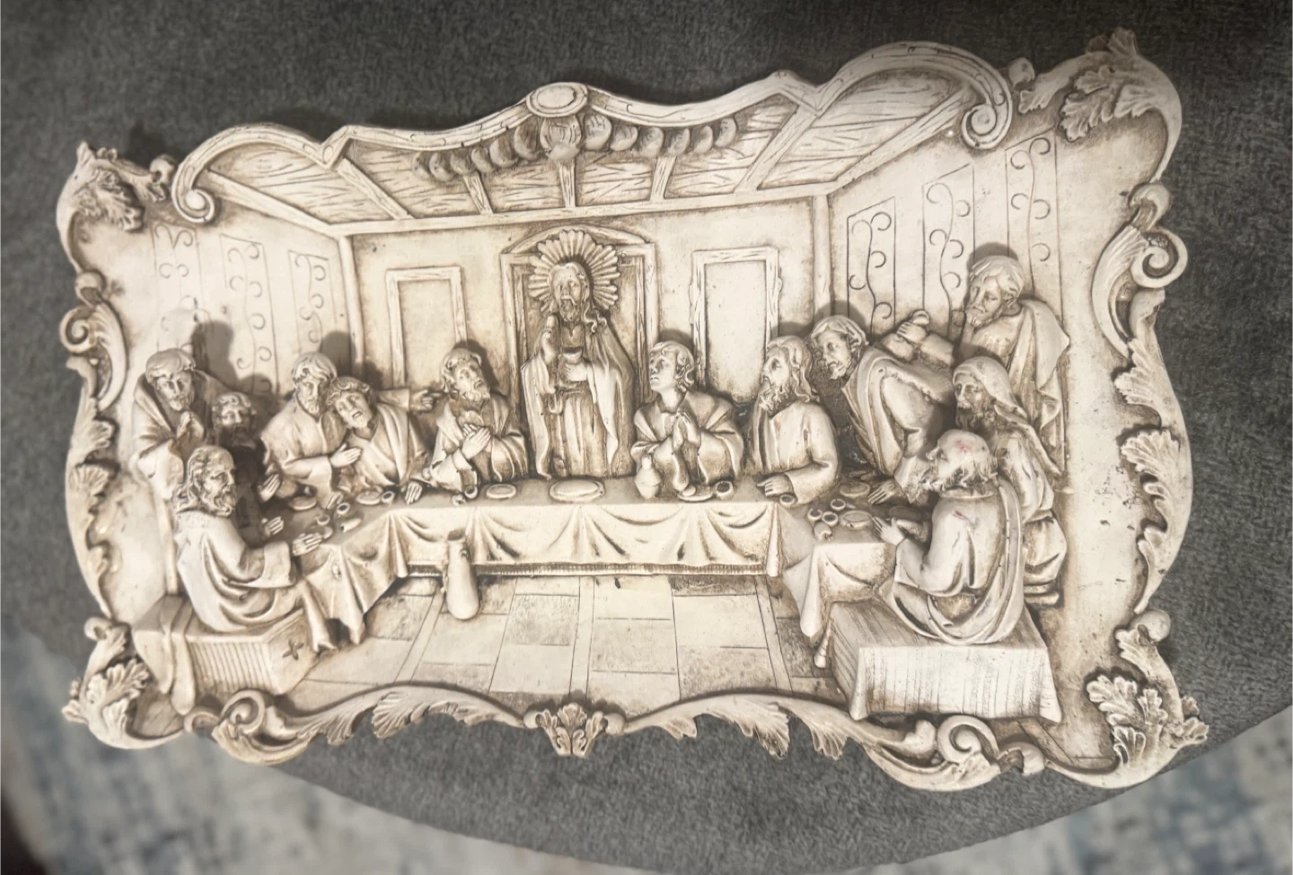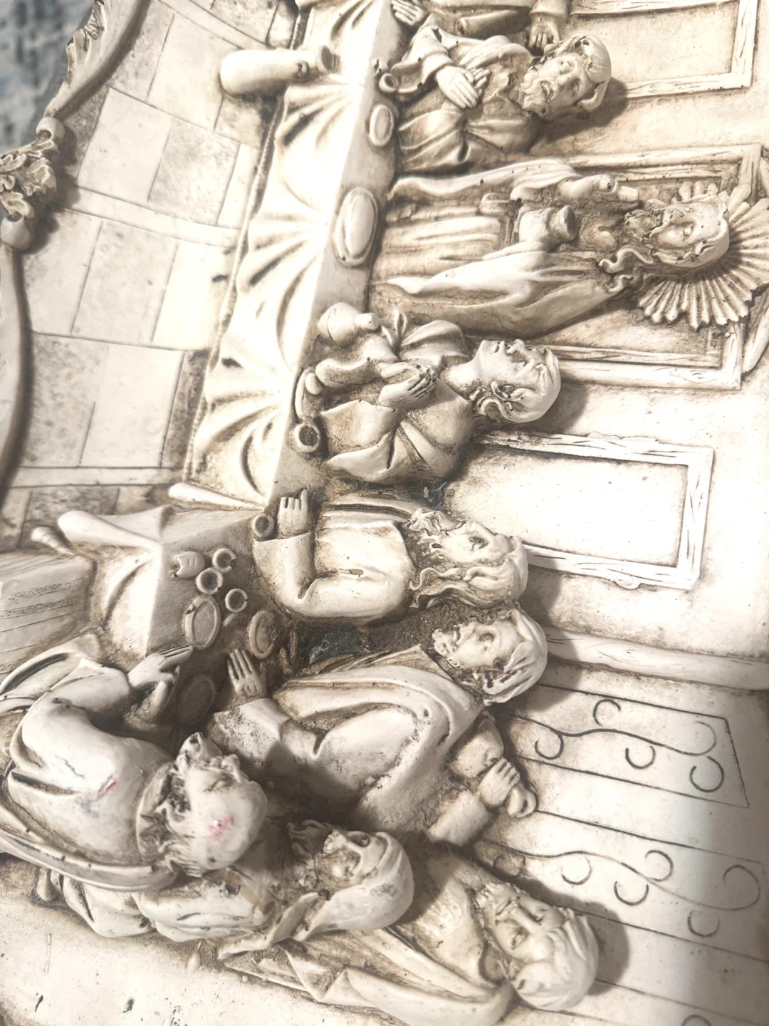 This detailed wall plaque depicts 'The Last Supper' scene. It's made from a resin material with an antique finish. It's a great piece for religious decor, collectible