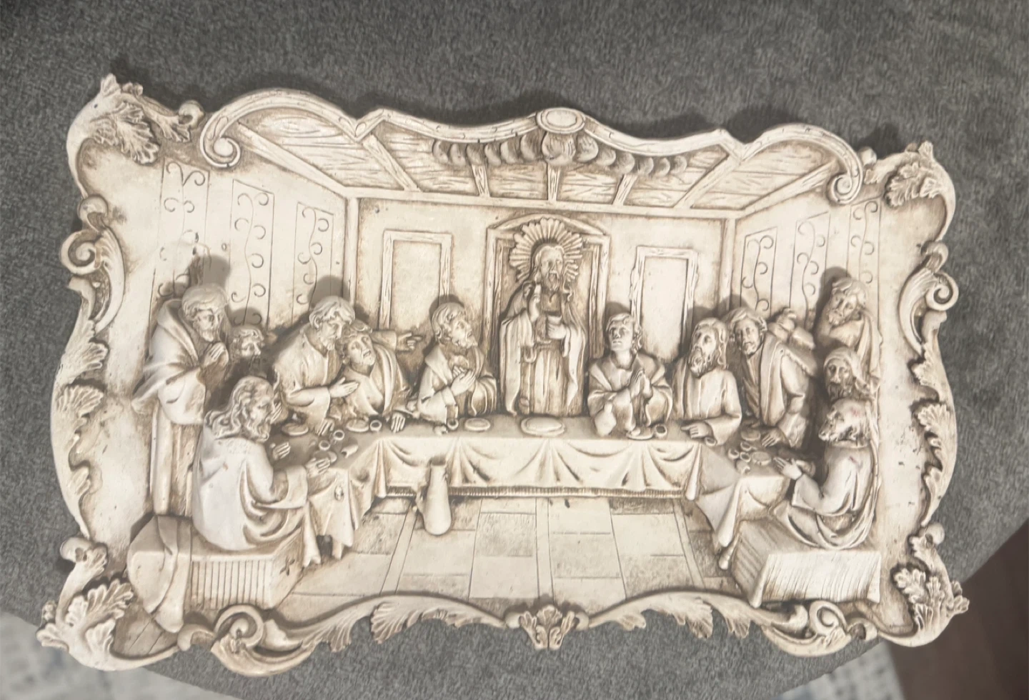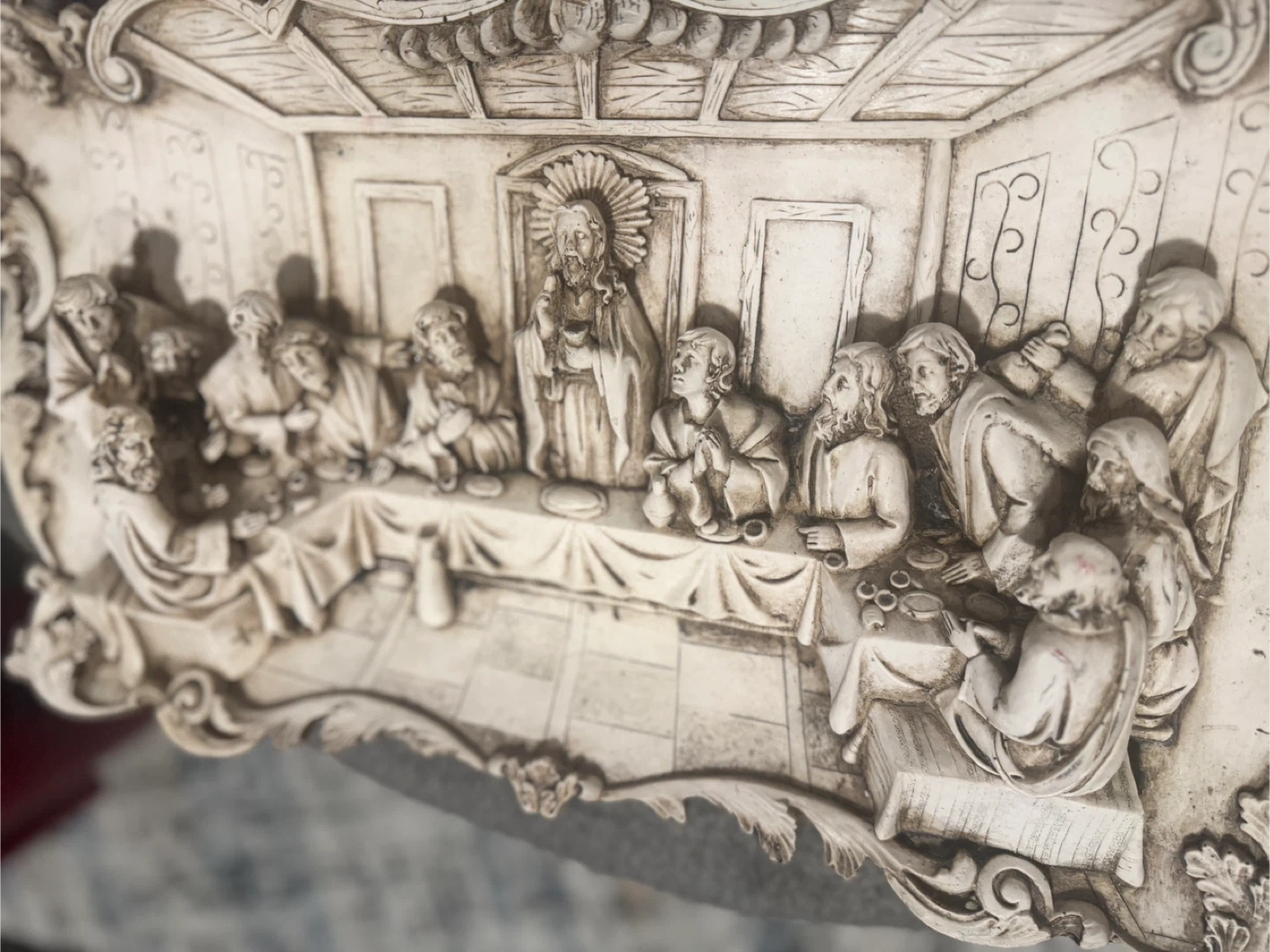 This detailed wall plaque depicts 'The Last Supper' scene. It's made from a resin material with an antique finish. It's a great piece for religious decor, collectible