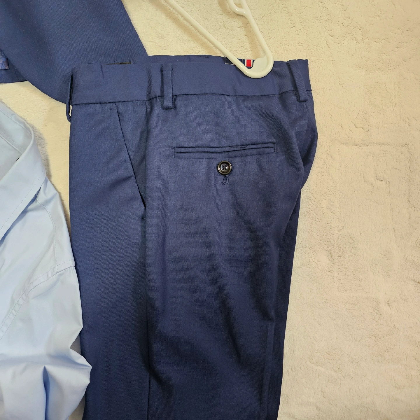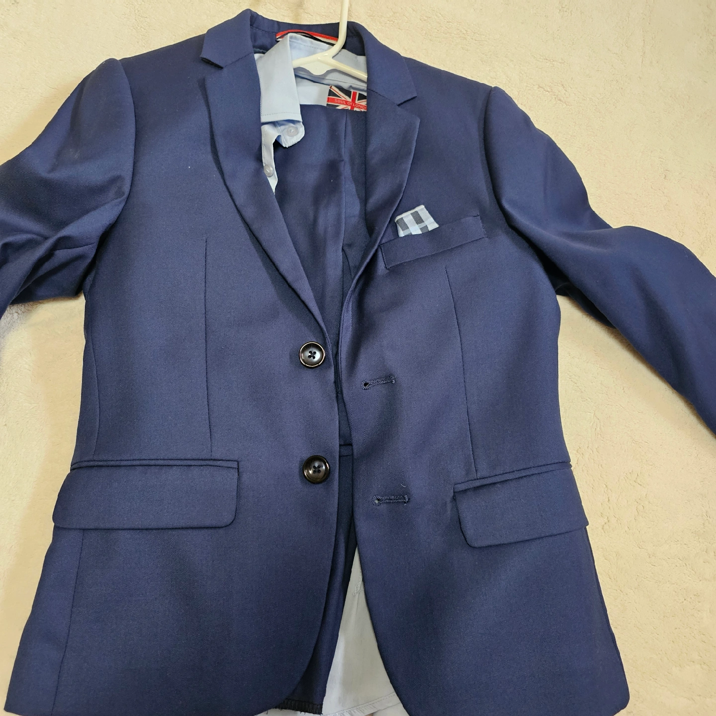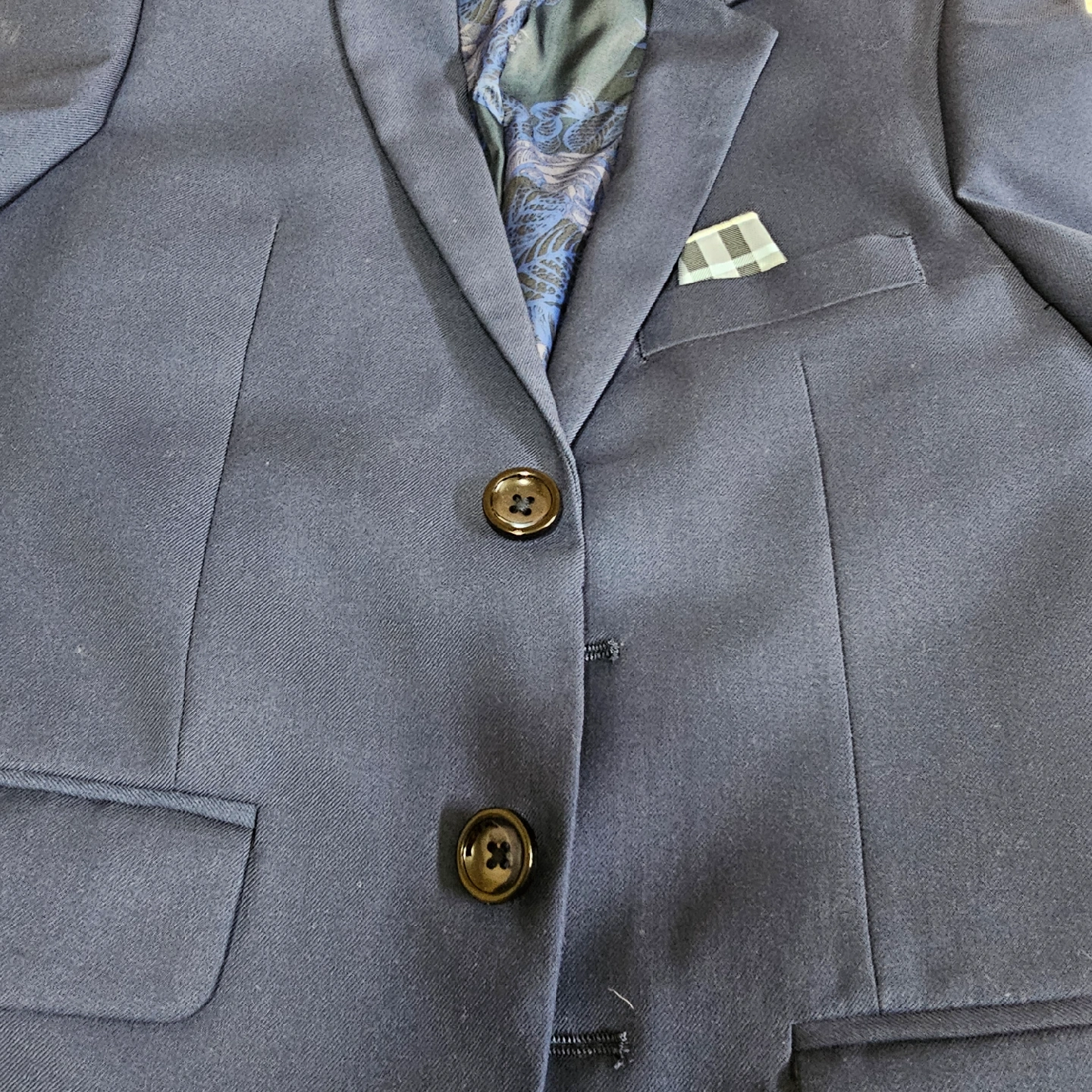 10Selling a cute little 3-piece suit for boys! Includes a navy blue jacket, matching pants, and a light blue button-up shirt. Great for special occasions or dress-up. The shirt has a Union Jack emblem.