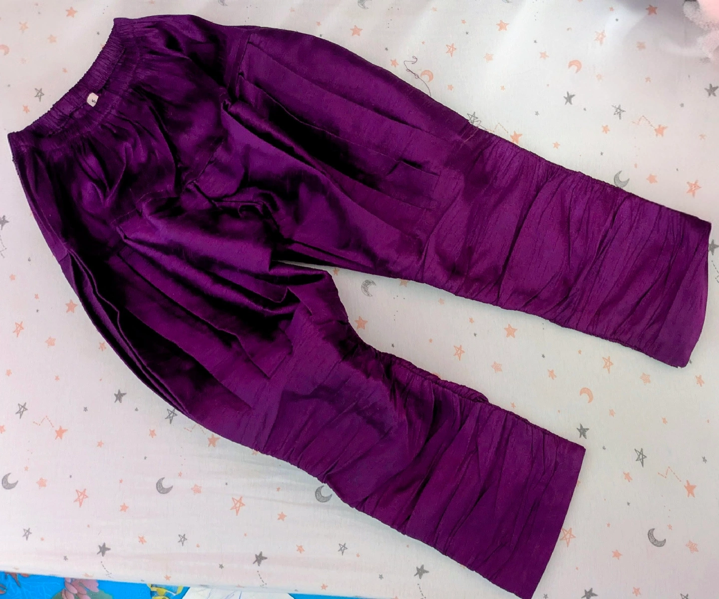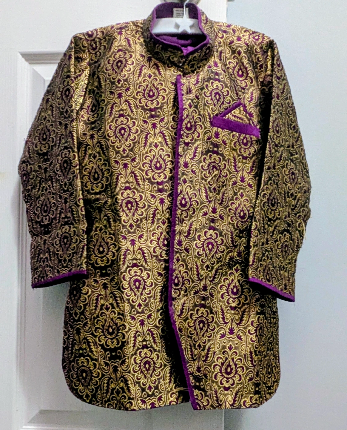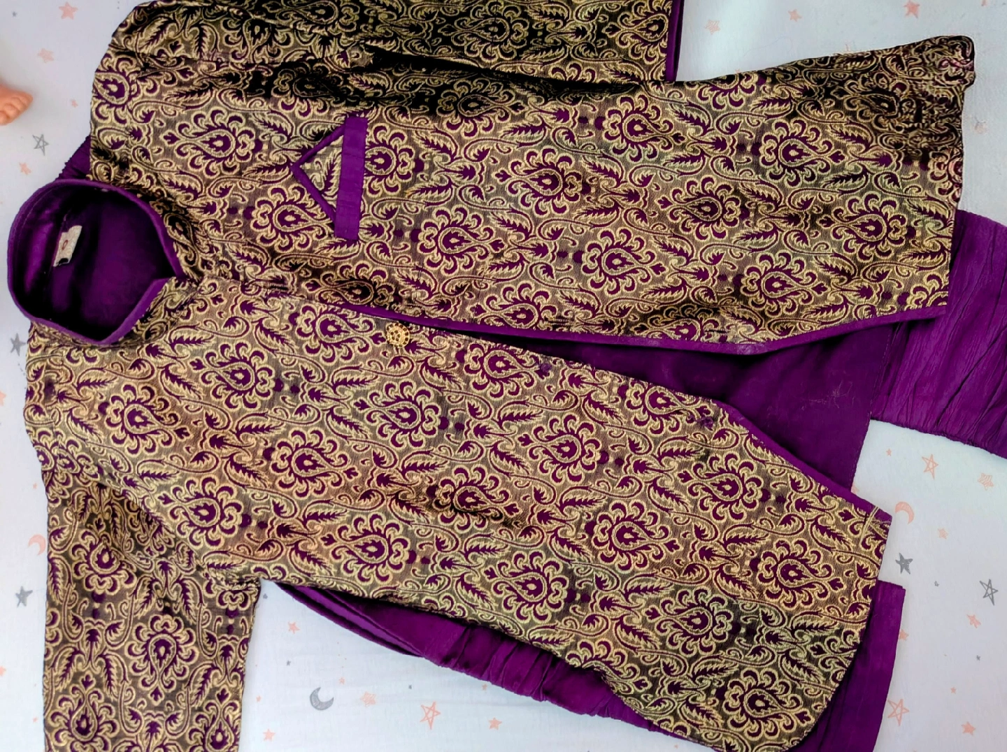 Selling a beautiful boys' Indian outfit in gold and purple. This set includes a patterned jacket and solid purple pants. Perfect for special occasions!