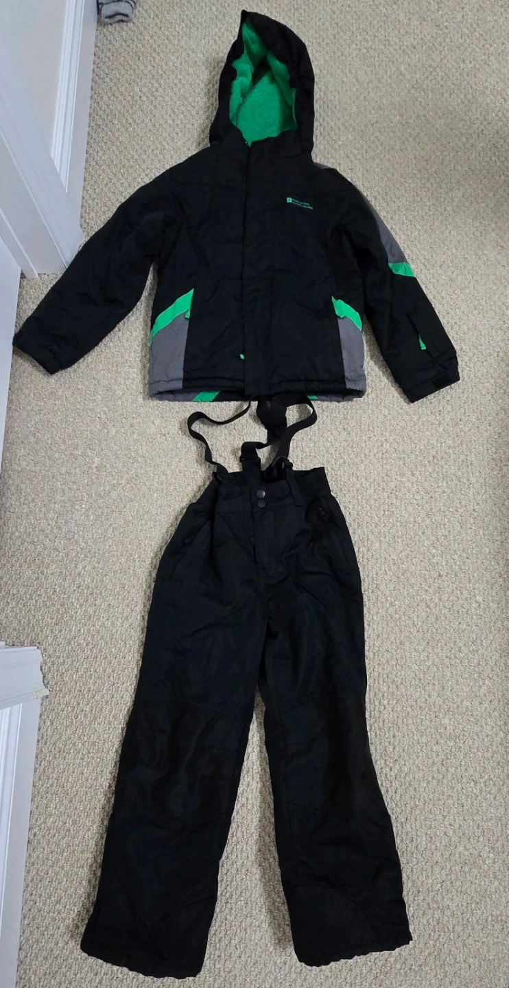 10Selling a Mountain Warehouse ski jacket and pants set. The jacket is black with grey and green accents, and the lining is green. The snowpants are black and include suspenders. Both items are size 7/8