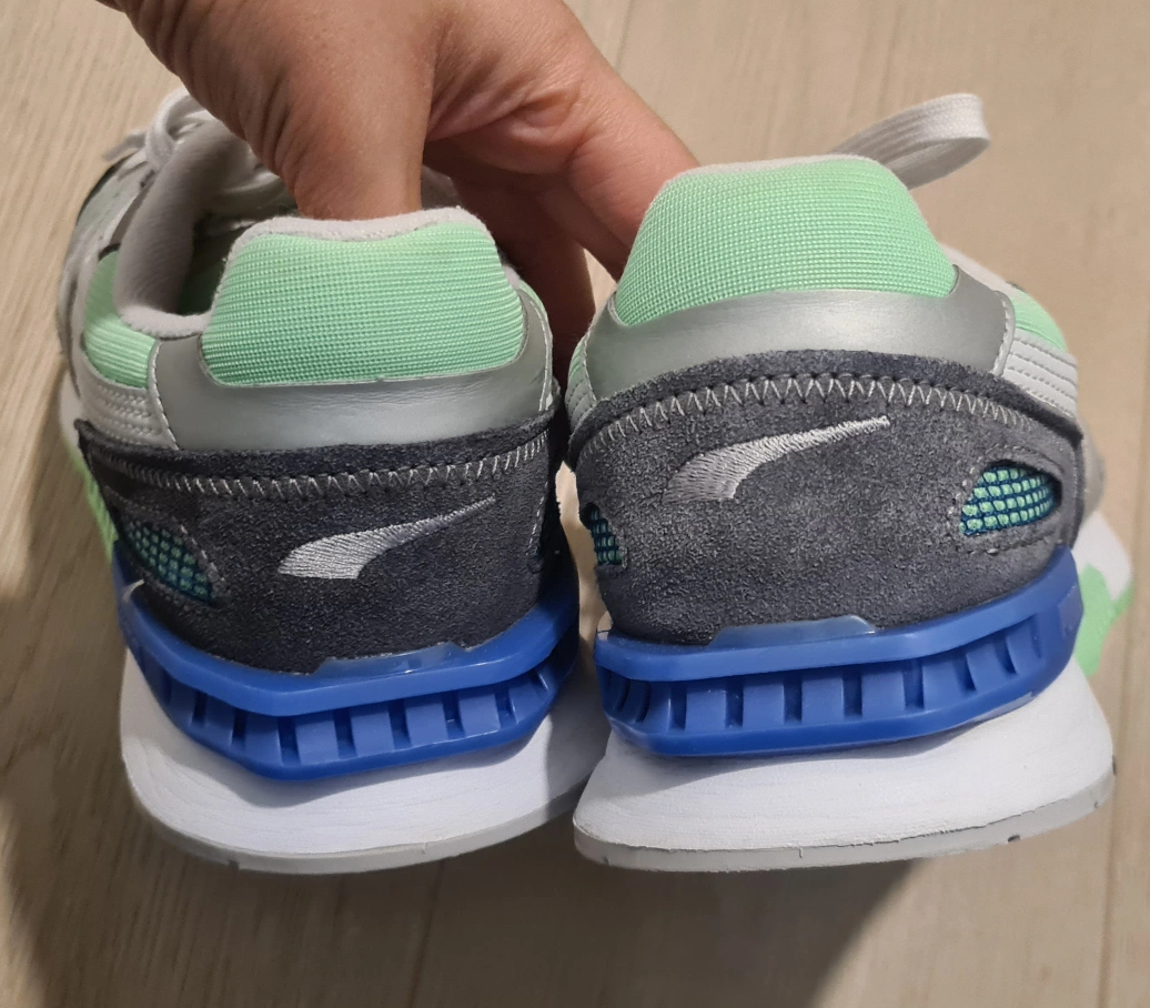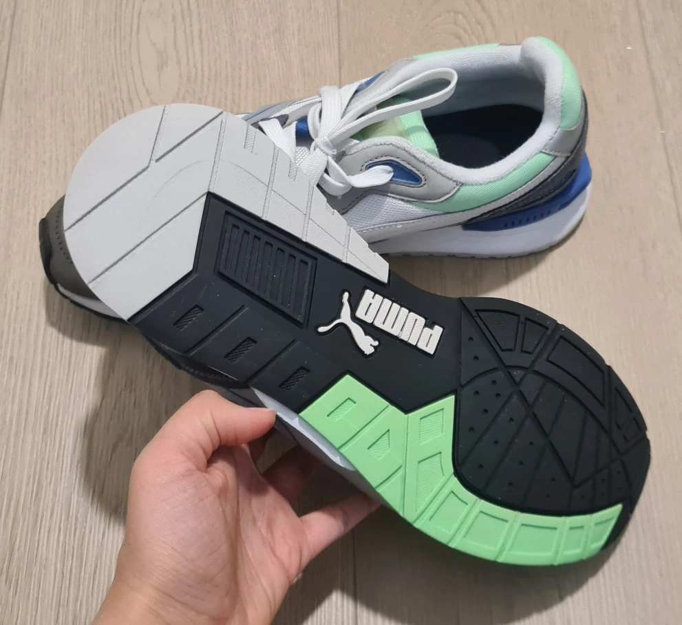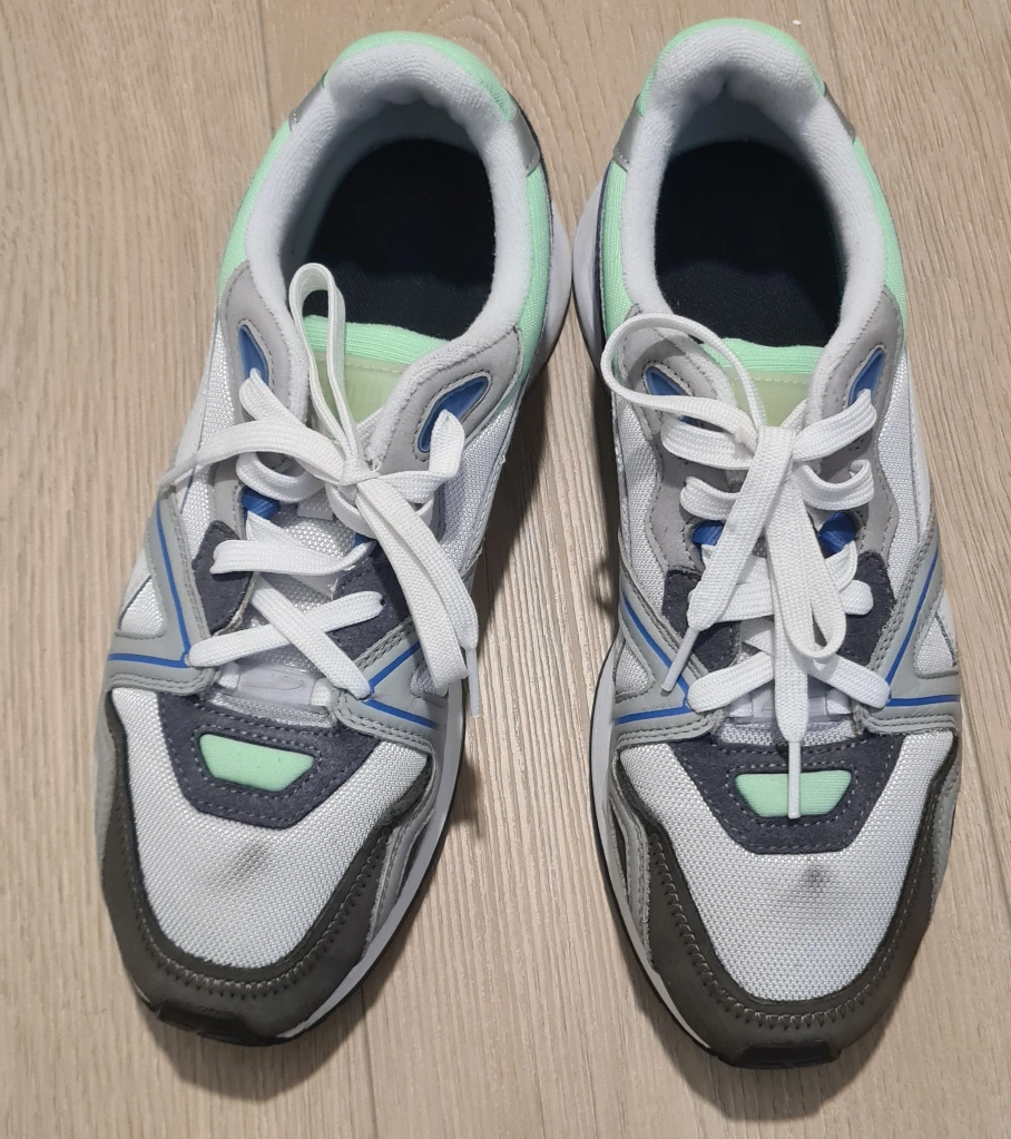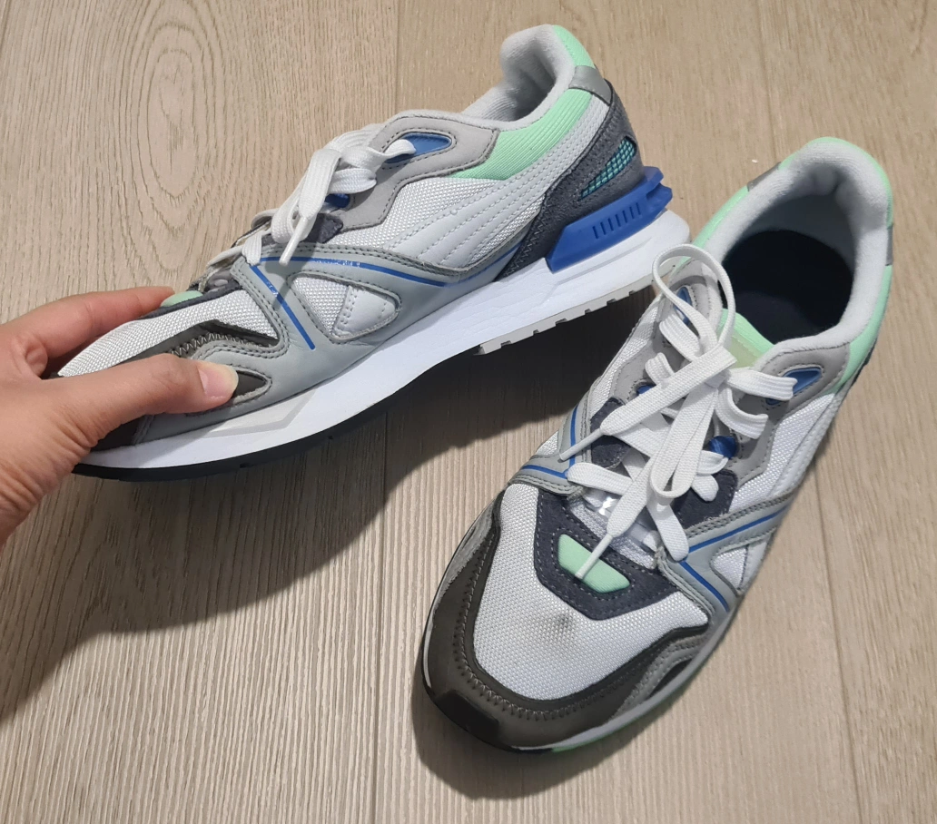 -Pre-owned Puma running shoes. -White, grey, and light green colour scheme. -Lace-up closure. -Minimal wear. Check photos for details. -Size 9.5 (US). Pick-up at Edmonds Station area.