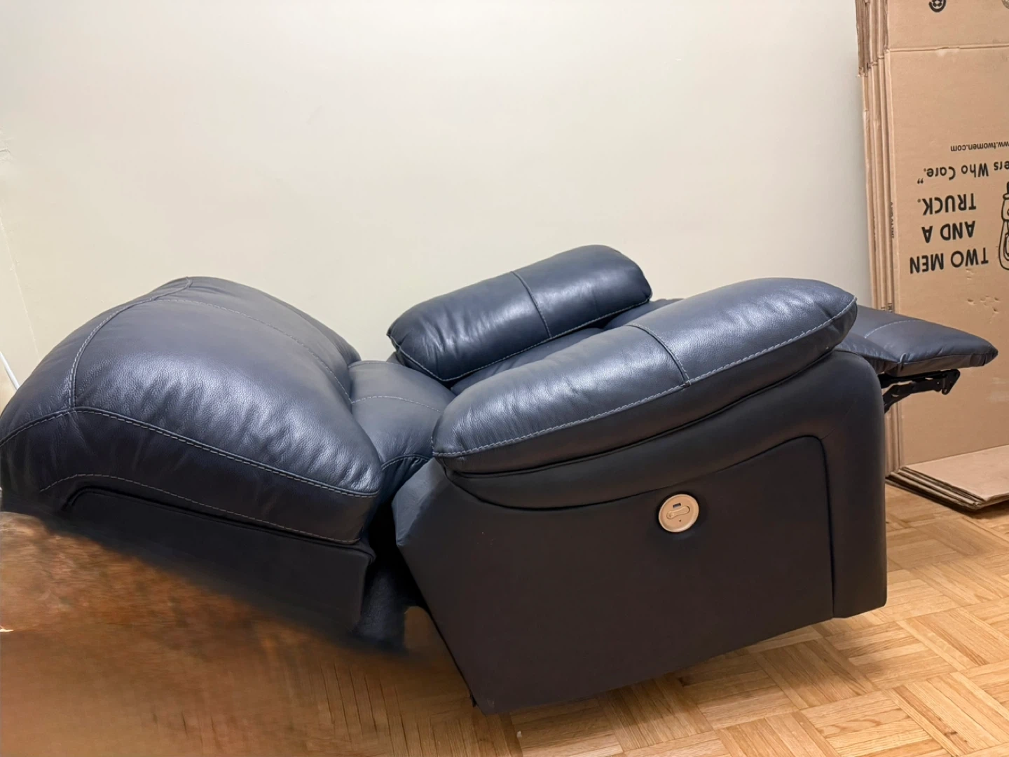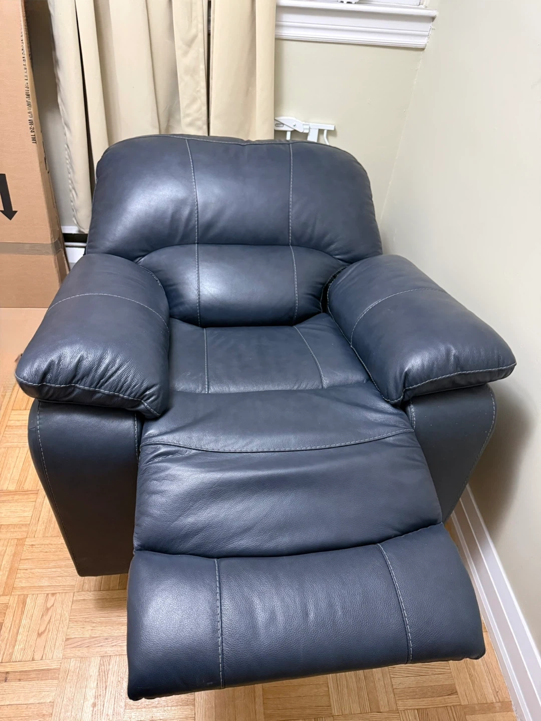 Comfortable navy blue electric rocker recliner chair with plush padding. It's made of faux leather and features a smooth reclining mechanism. This recliner would be great for relaxing in any living space. Its very easy to clean and maintain. It was bought new about 5 months ago. I’m only selling because I’m moving out of the province. Honestly, I love this recliner. 😭
