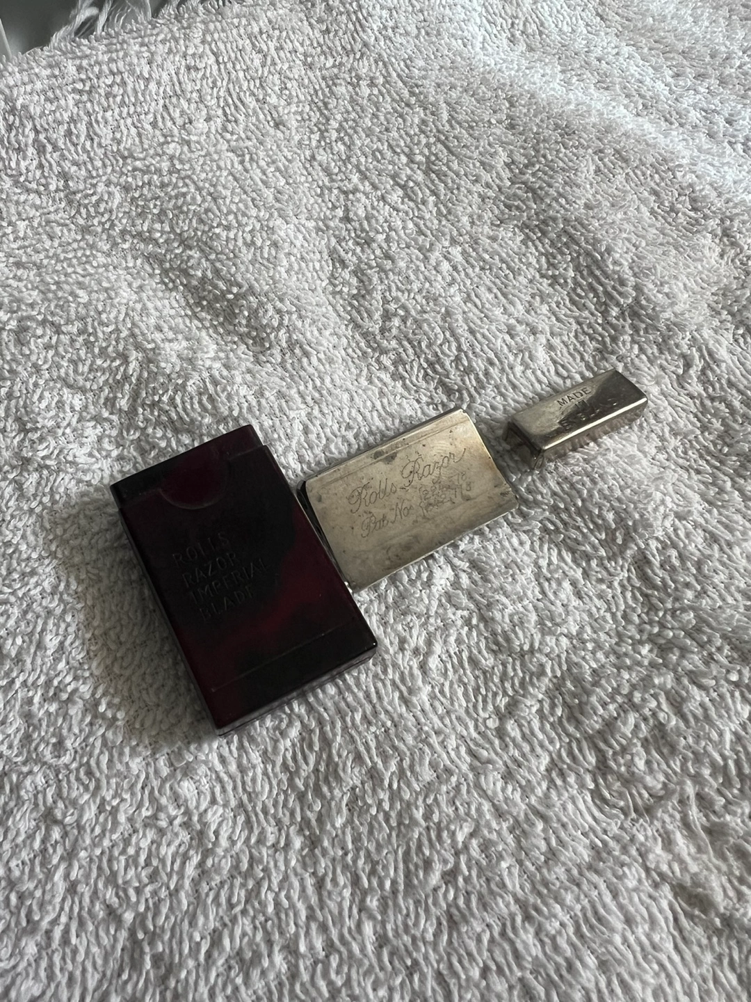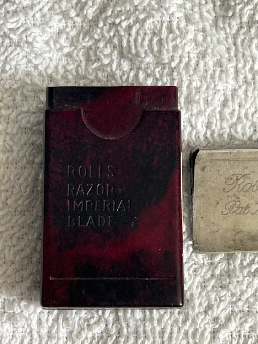 Collection of vintage shaving items. Includes Rolfs Razor Imperial blade case, Sheffield steel blade, Made in England. Patented design. Collectible.