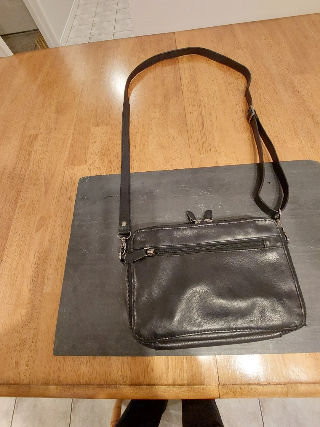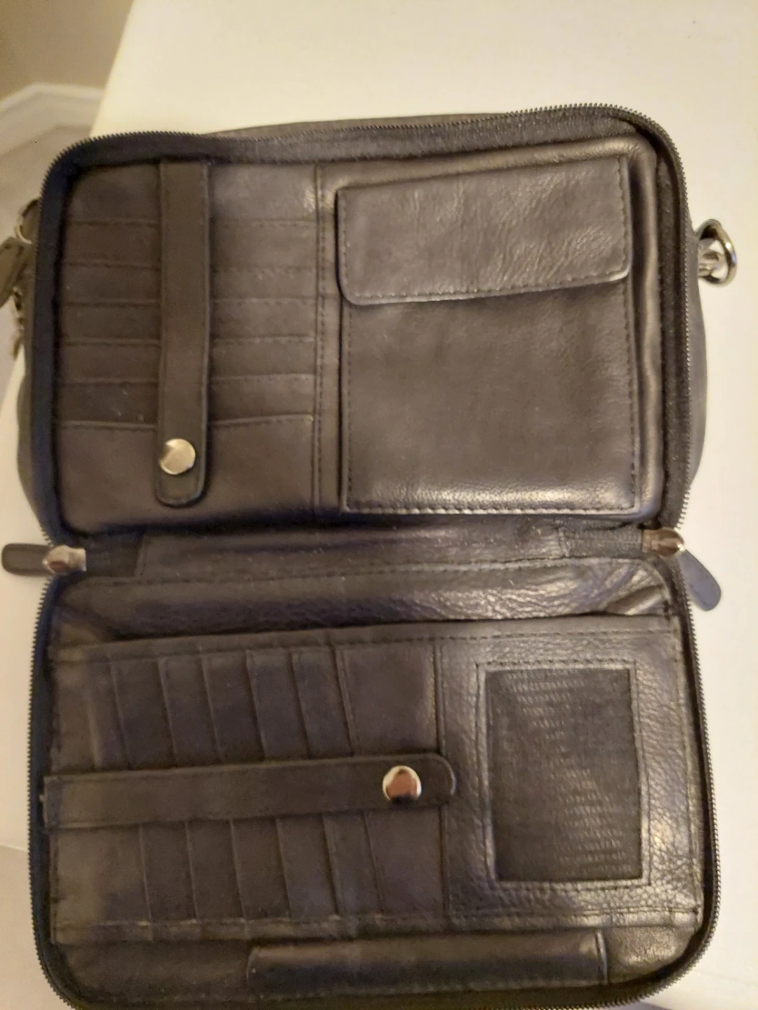 Here's a black leather crossbody bag with lots of compartments! It's perfect for keeping your essentials organized while you're on the go. The condition is good, with some signs of use.