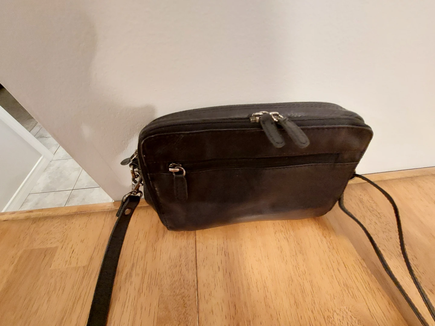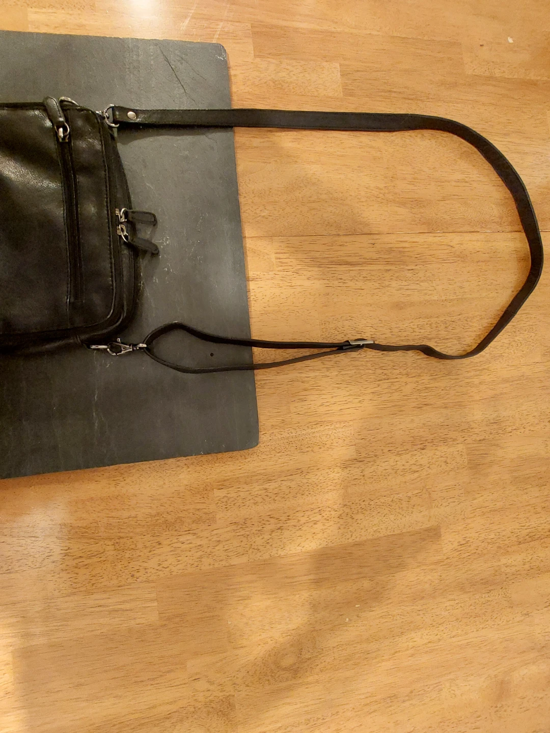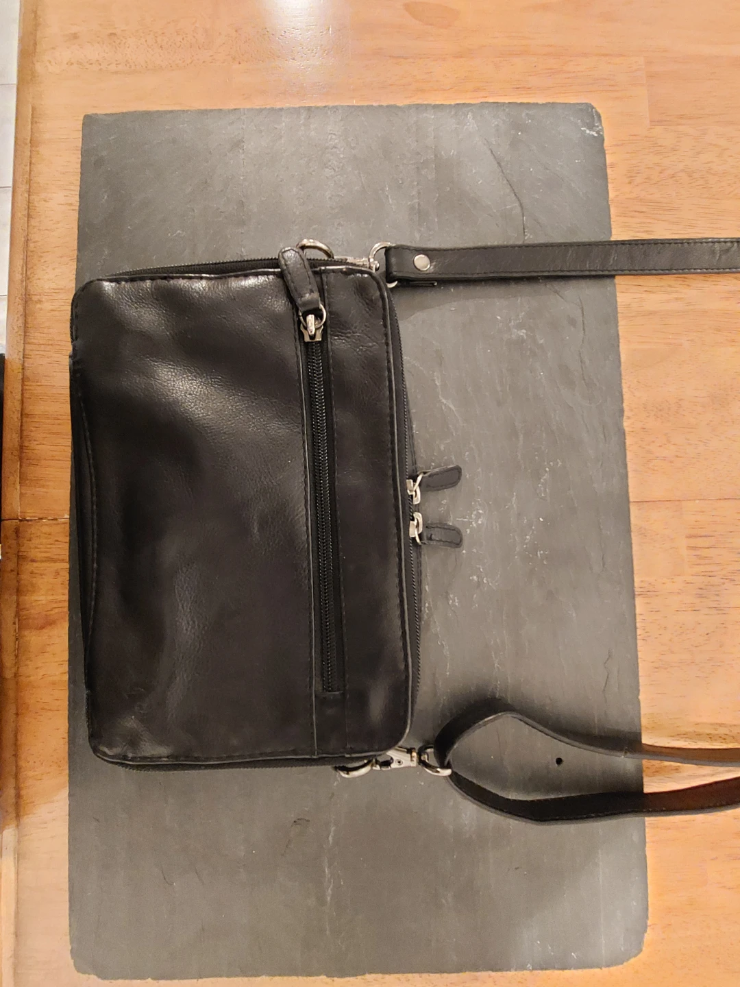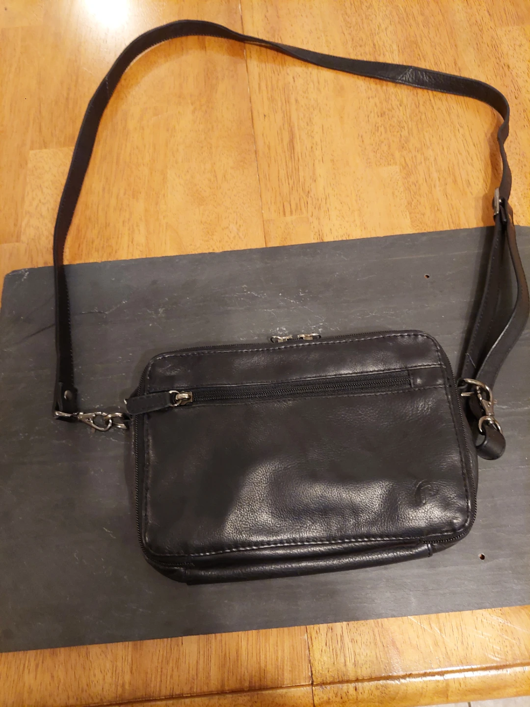 Here's a black leather crossbody bag with lots of compartments! It's perfect for keeping your essentials organized while you're on the go. The condition is good, with some signs of use.