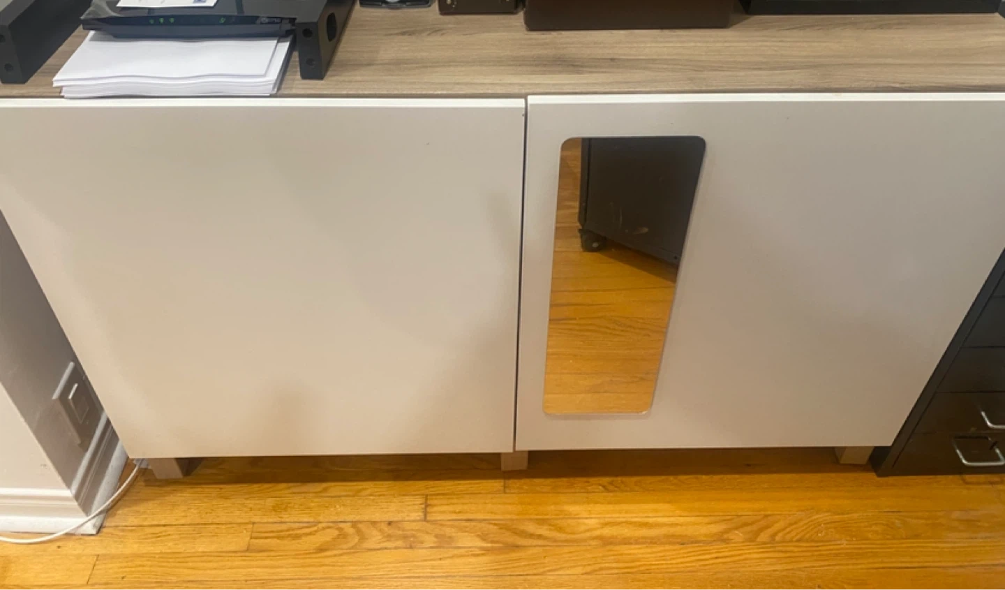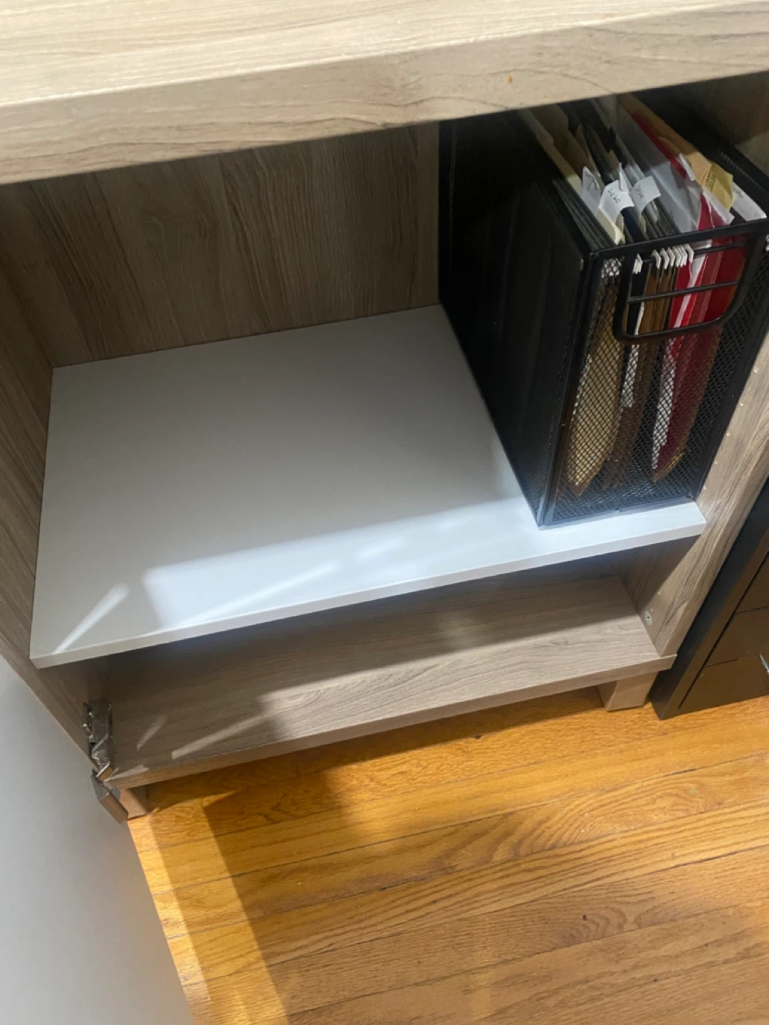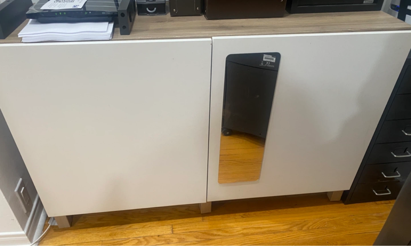 Selling a cabinet with white doors. It has a light wood-look top and a shelf inside. Great for storage!
