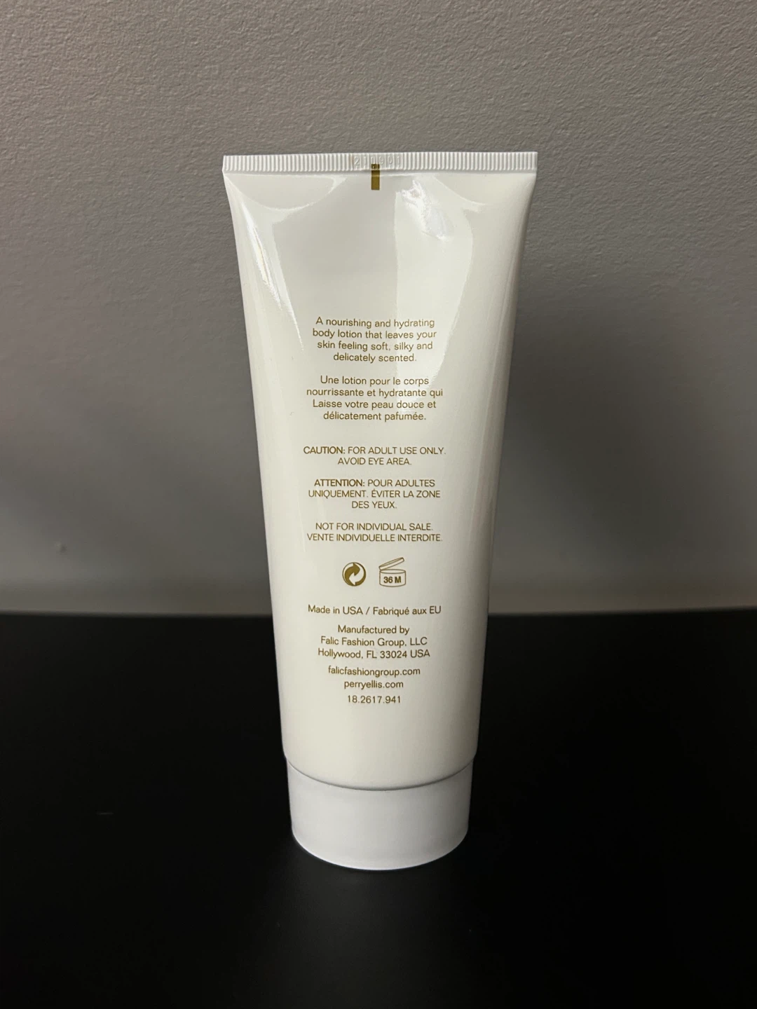 360° Perry Ellis body lotion for women. A nourishing and hydrating body lotion that leaves your skin feeling soft, silky, and delicately scented. Scent notes include melon, lily, osmanthus, tangerine, and rose as top notes; lily-of-the-valley, water lily, lavender, and sage as middle notes; and musk, sandalwood, vetiver, amber, and vanilla as base notes. 6.7 fl oz / 200 ml. Brand new - unopened/unused.