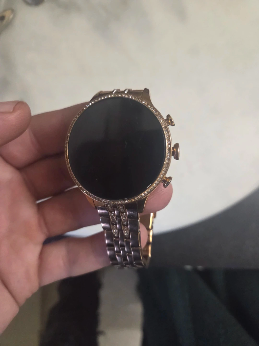 A rose gold Fossil smartwatch with a diamond-accented bezel. It features a digital display and a metal link band. This stylish watch is great for everyday wear and keeping track of your notifications.