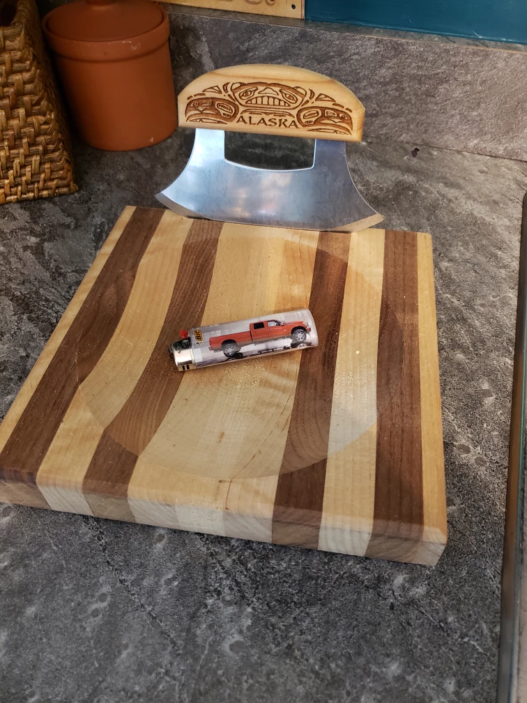 Giving away an Alaska Ulu knife and wooden cutting board set. The knife handle has 'ALASKA' engraved on it. The cutting board is made of wood with alternating light and dark stripes. Great for chopping herbs and vegetables in your kitchen!