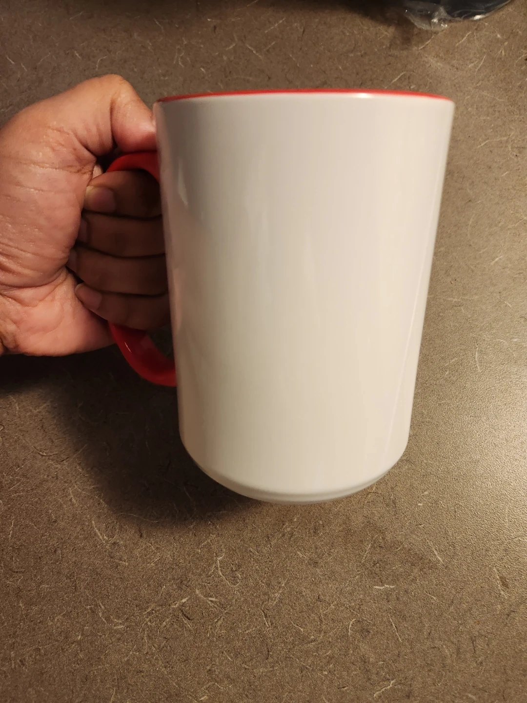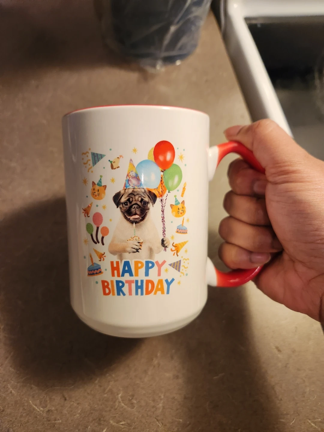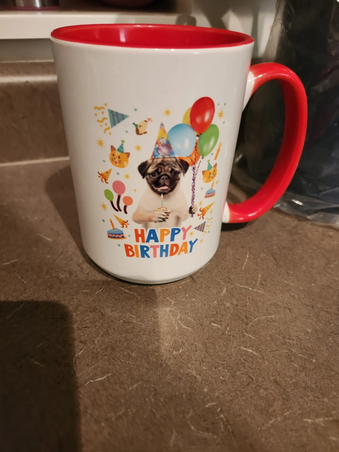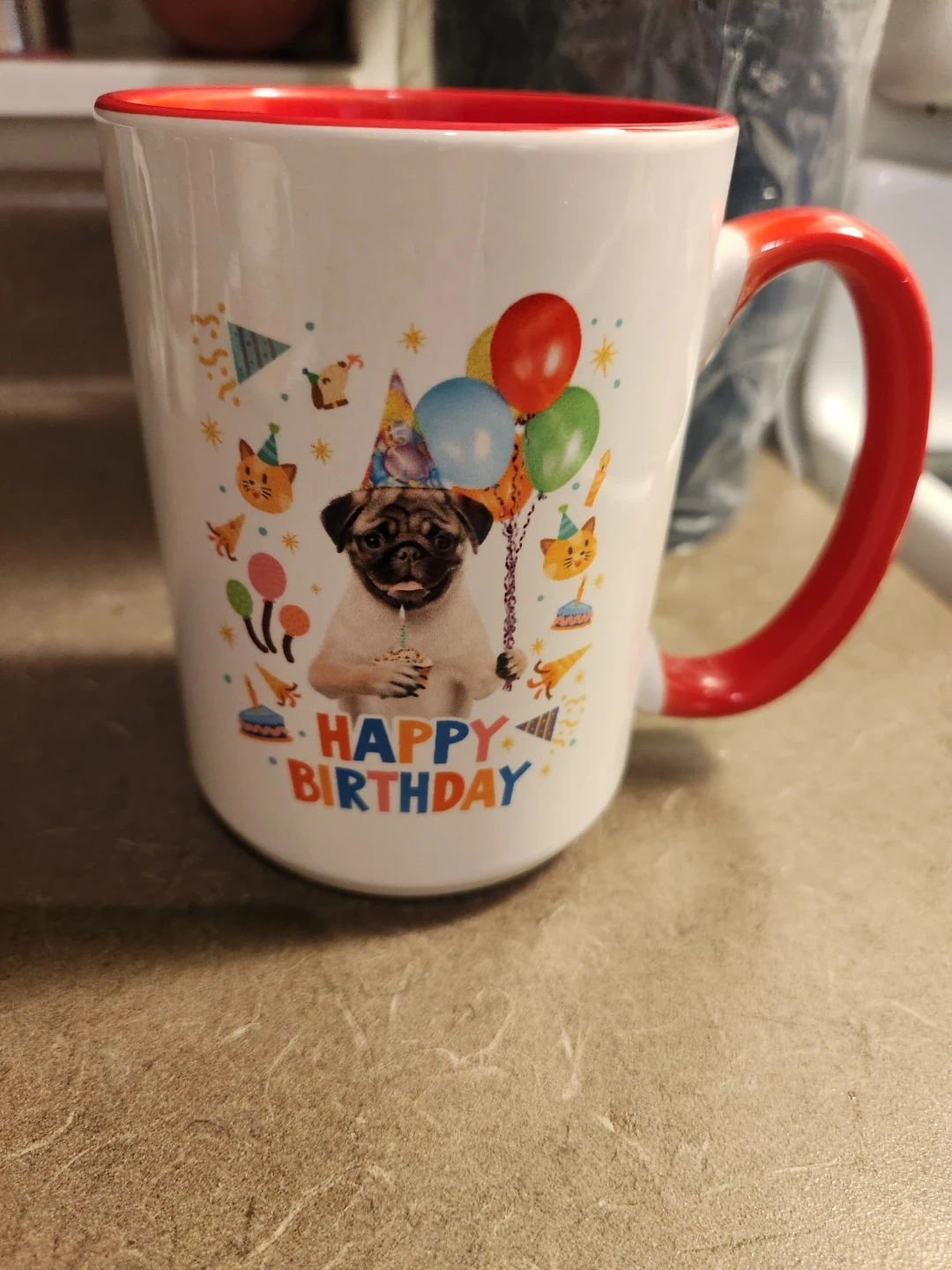This is a white mug with a red interior and handle. It features a cute pug wearing a party hat, holding a cupcake, with balloons and "HAPPY BIRTHDAY" text. It's a fun way to celebrate a birthday!