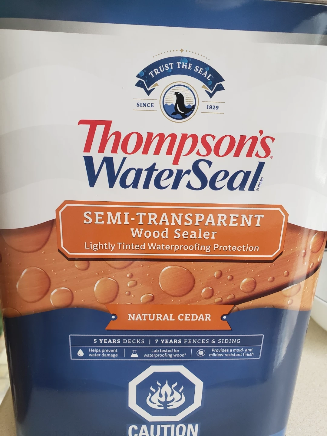 Waterproof wood sealer in a metal container. With a handle and a white cap. A great way to protect your wood and give it a beautiful finish.