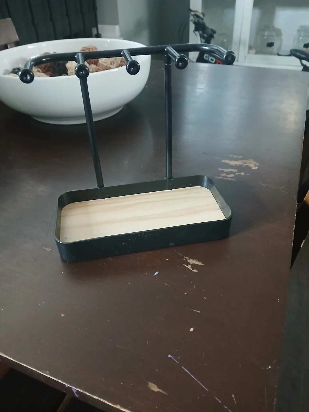 A practical stand with a black metal frame and a light wood tray. It's designed to hold necklaces, bracelets, or keys. This organizer would be useful on a dresser or entryway table.