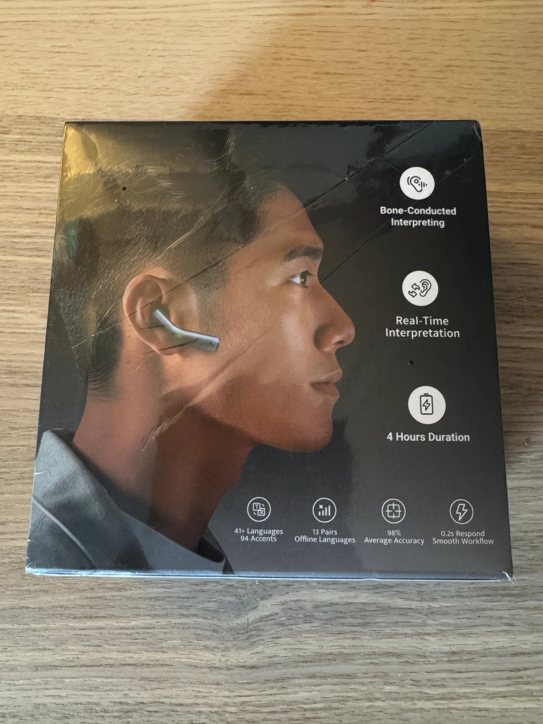Timekettle W4 AI Interpreter Earbuds with bone-conducted interpreting. Real-time translation supports 41 languages offline and 94 languages online with 98% average accuracy. Offers 4 hours duration per charge and 0.2s smooth workflow. Includes original box.