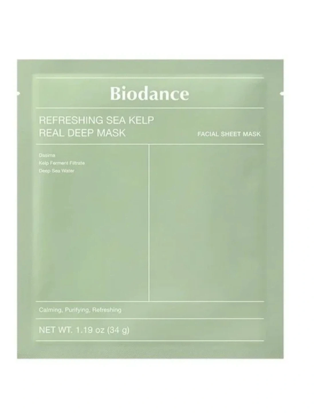 I have a Biodance Refreshing Sea Kelp Real Deep Mask for sale! This facial sheet mask contains Dasima, Kelp Ferment Filtrate, and Deep Sea Water. It's designed to be calming, purifying, and refreshing. Net weight is 1.19 oz (34 g)