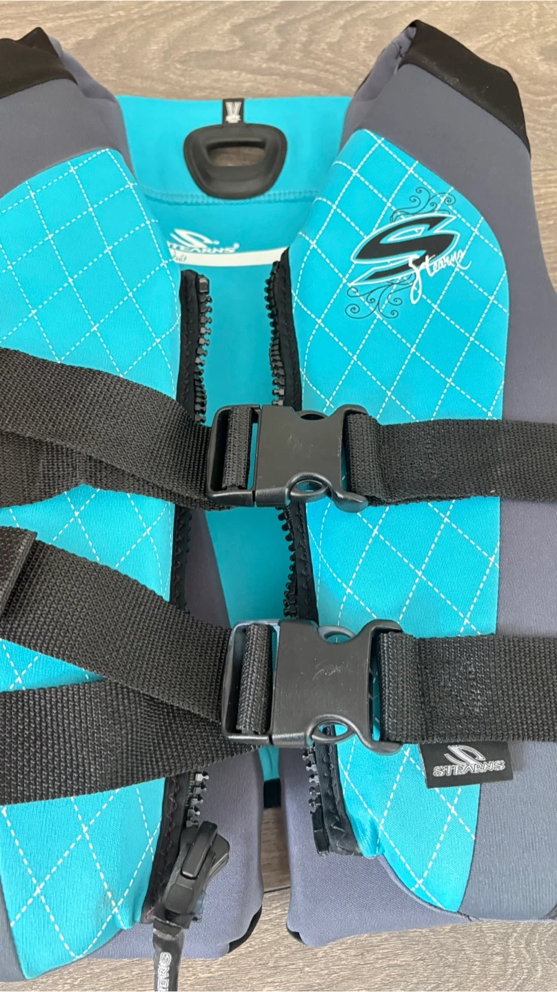 Stearns adult life vest in a vibrant blue and grey. It features adjustable straps and buckles for a secure fit. Zipper closure on the front. Designed for water sports and boating safety.