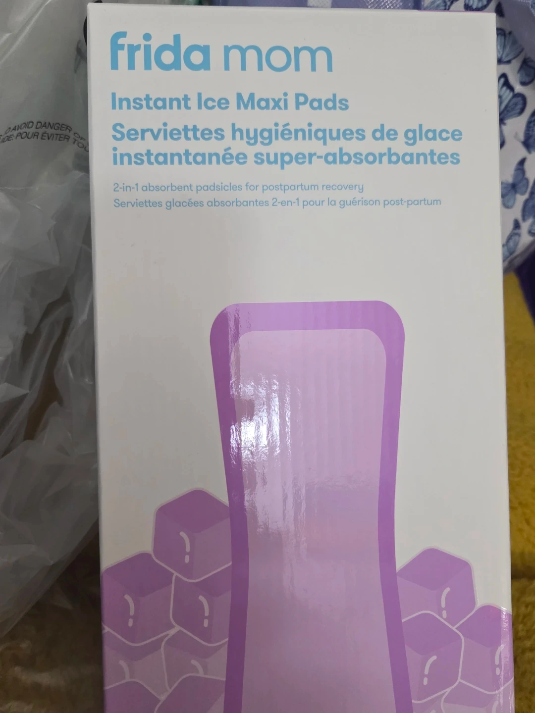 Selling a box of Frida Mom Instant Ice Maxi Pads. These are 2-in-1 absorbent padsicles designed for postpartum recovery. The box includes individually wrapped pads for instant cooling and relief after childbirth