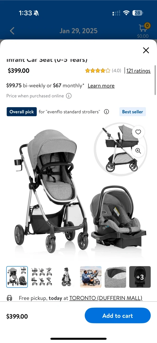 This Evenflo infant car seat and stroller travel system comes in a heather grey colour. It's designed for infants aged 0-3 years. The system includes a car seat, infant toddler seat , and stroller. I just used the car seat with the stroller for 8 months, the other part is new. I bought it with 429$ I want to sell it with 150$.