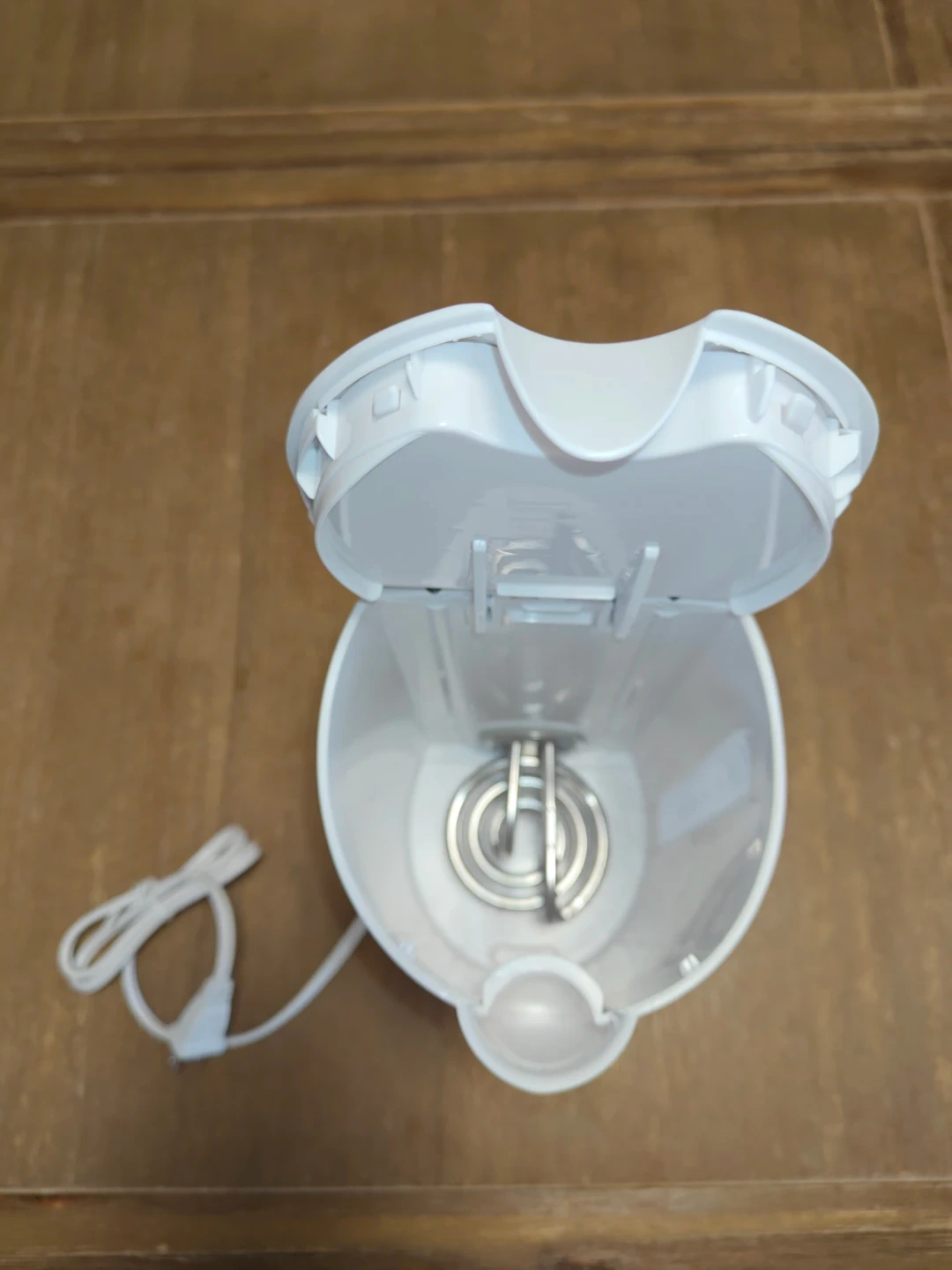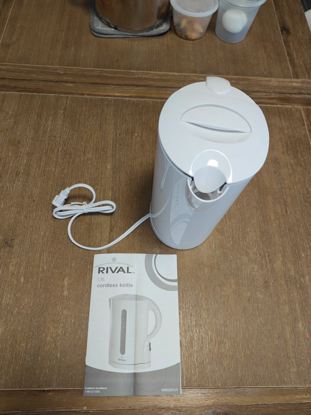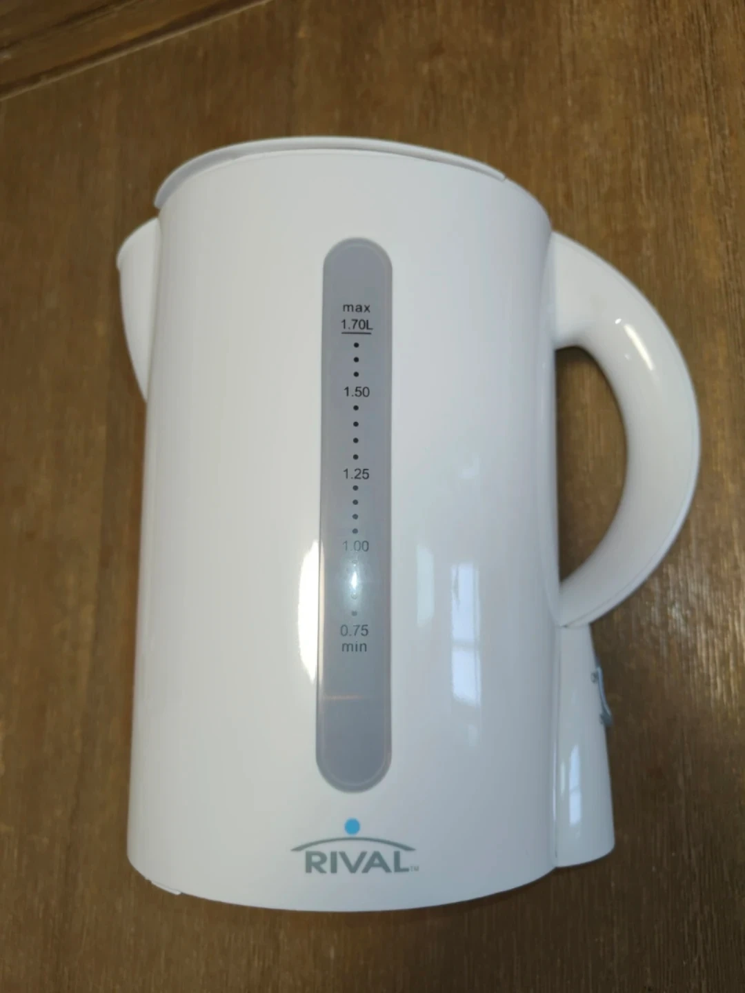 This is a white Rival cordless electric kettle. It has a 1.7-litre capacity and comes with its power base and cord. The kettle is made of plastic. It's handy for quickly boiling water for tea or coffee.