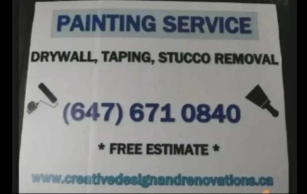 Offers painting services including drywall, taping, and stucco removal. Contact (647) 671-0840 for a free estimate. Visit www.creativedesignandrenovations.ca for more information.