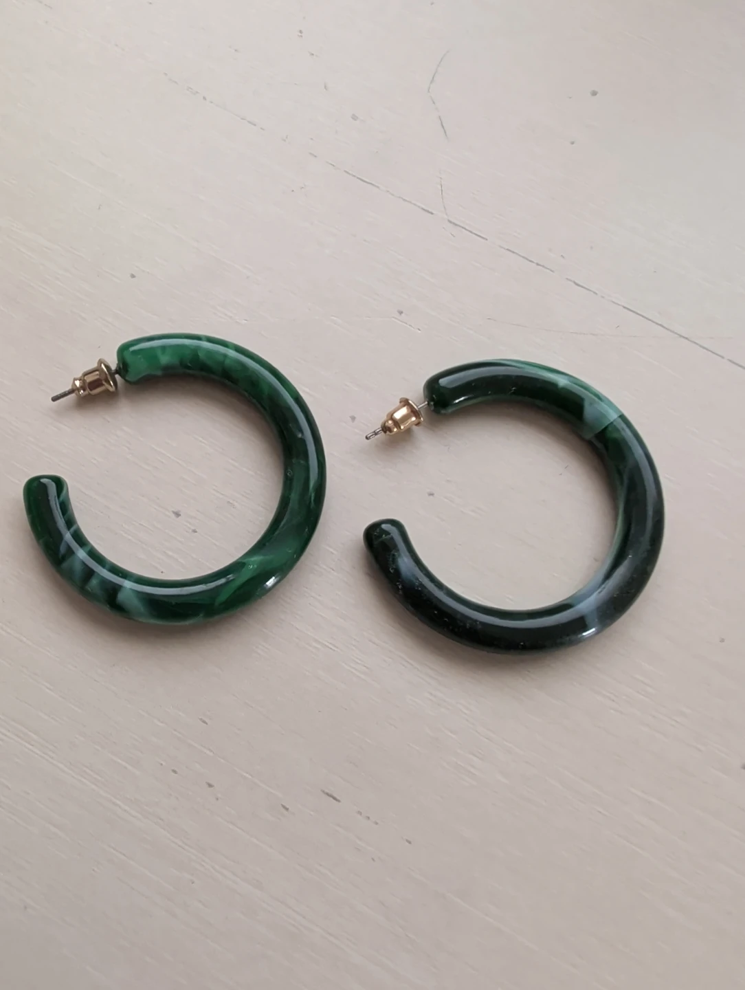 A pair of stylish hoop earrings with a marbled green design. They're made from acrylic material and feature gold-tone posts. These earrings add a pop of colour to any outfit!