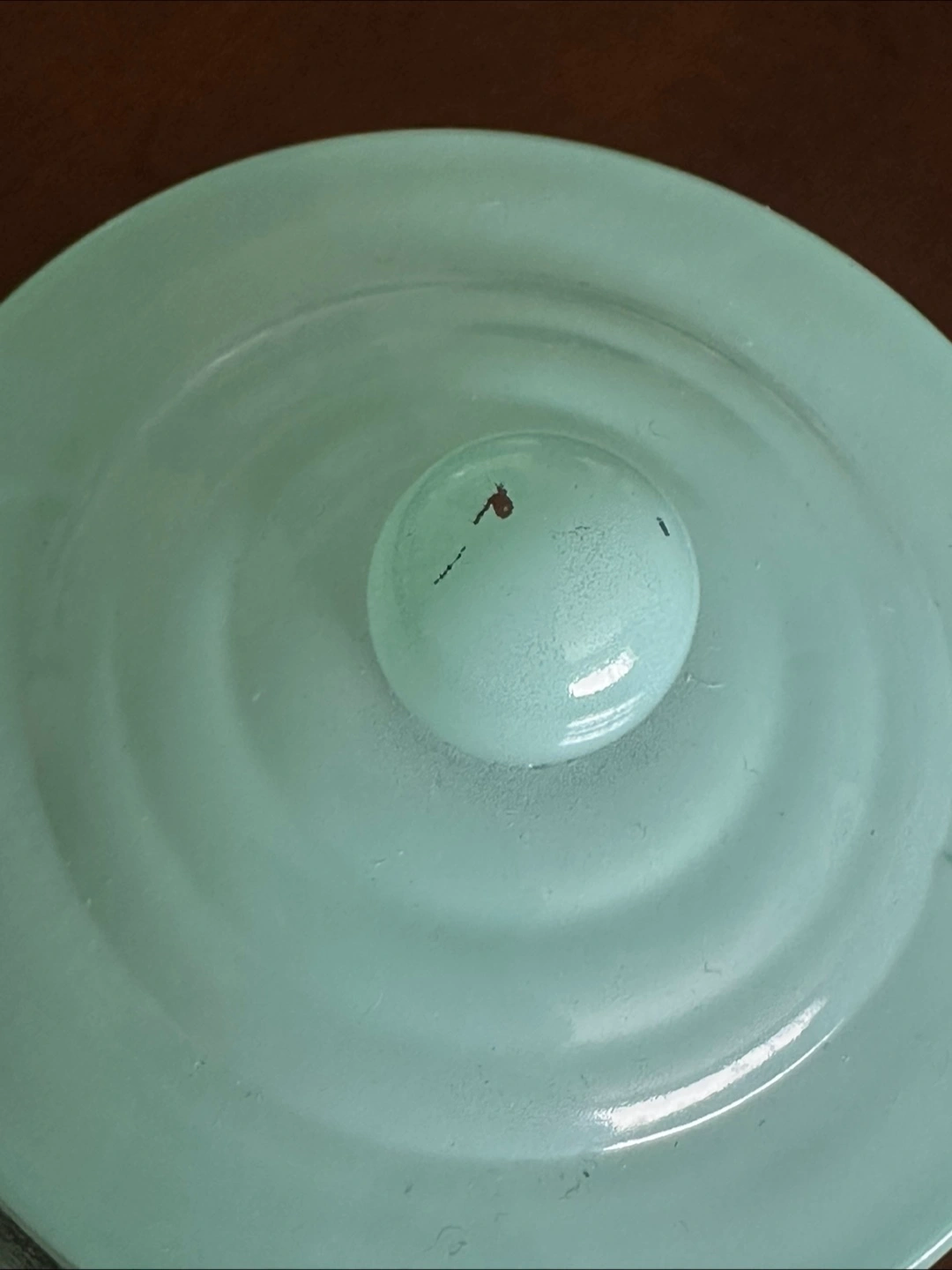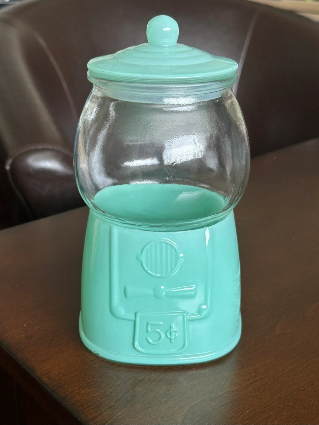 Glass gumball jar. Teal colour. Features a glass jar and a mint green base. Small chips on the base. Perfect for candy or décor.