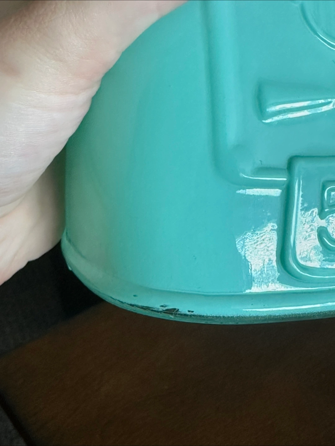 Glass gumball jar. Teal colour. Features a glass jar and a mint green base. Small chips on the base. Perfect for candy or décor.