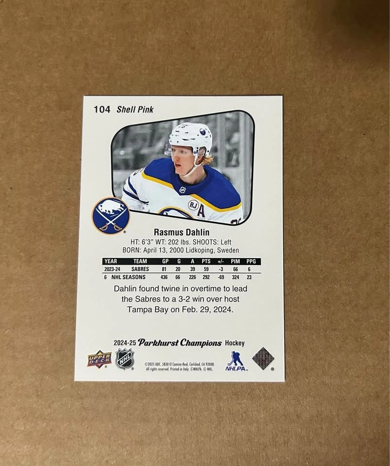 Buy & Sell2024-25 Parkhurst Rasmus Dahlin Shell Pink /99 - Sabres2024-25 Parkhurst Rasmus Dahlin Shell Pink /99 - Sabres$15Feel free to message if you have any questions!WHERE TO MEETHomeView MapSELLERverifiedTylenWolseley993 reviews0 chats·0 favorites·1 viewsSEND CHAT TO SELLERHi Tylen! I’m interested in your listing.Hi Tylen! I’m interested in your listing.Get the Karrot app to chatSign In to chat