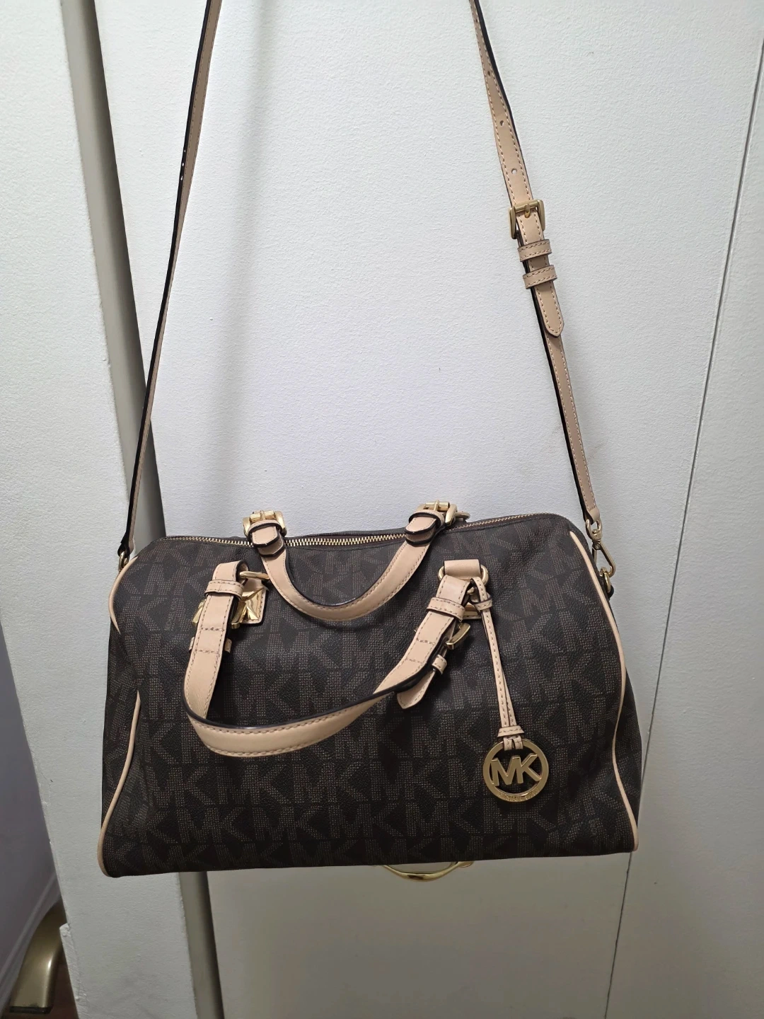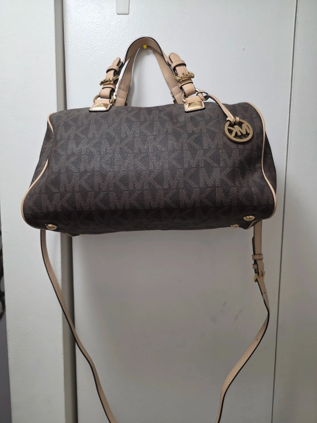This Michael Kors satchel bag features the classic MK monogram pattern. It has top handles and an adjustable crossbody strap for versatile carrying. Gold-tone hardware accents the bag's design. It's a stylish choice for everyday use!