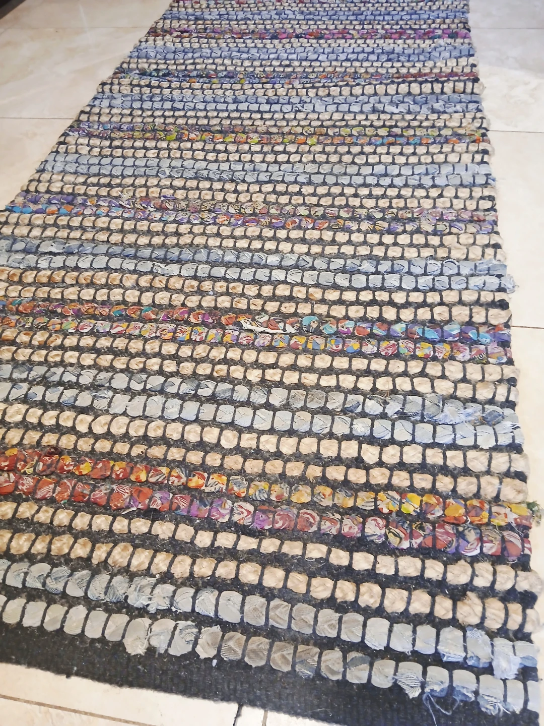 This FREE cotton runner rug features a colourful striped pattern. It's made from woven fabric. 75 x 29 inches, the rug is a good size for hallways or entryways.
