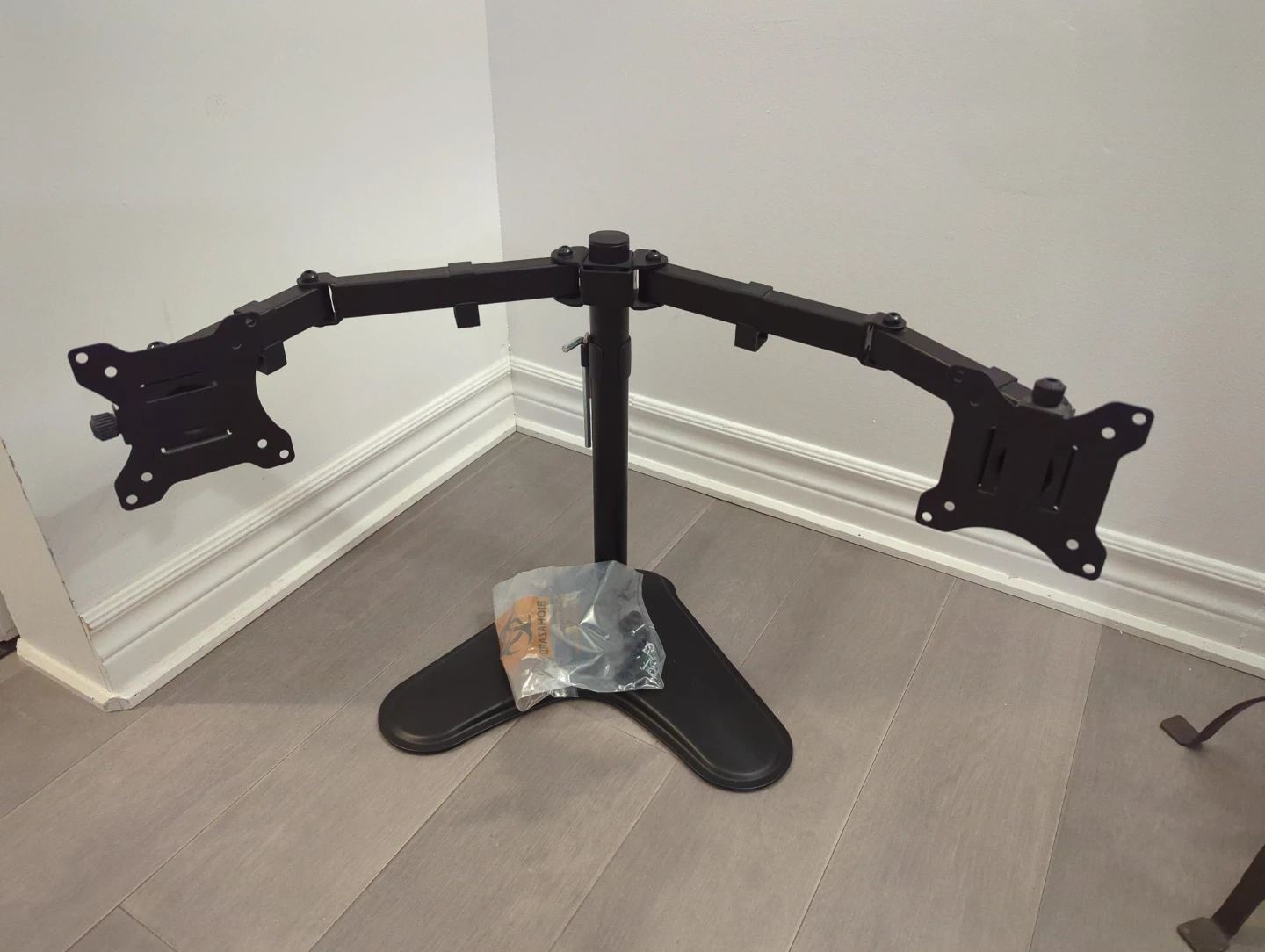 Selling a sturdy dual monitor stand in black. It's in great condition and comes with all the necessary components.