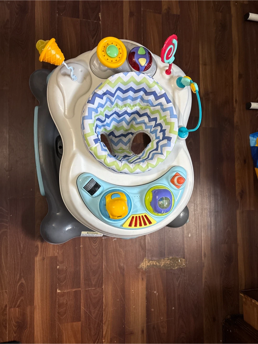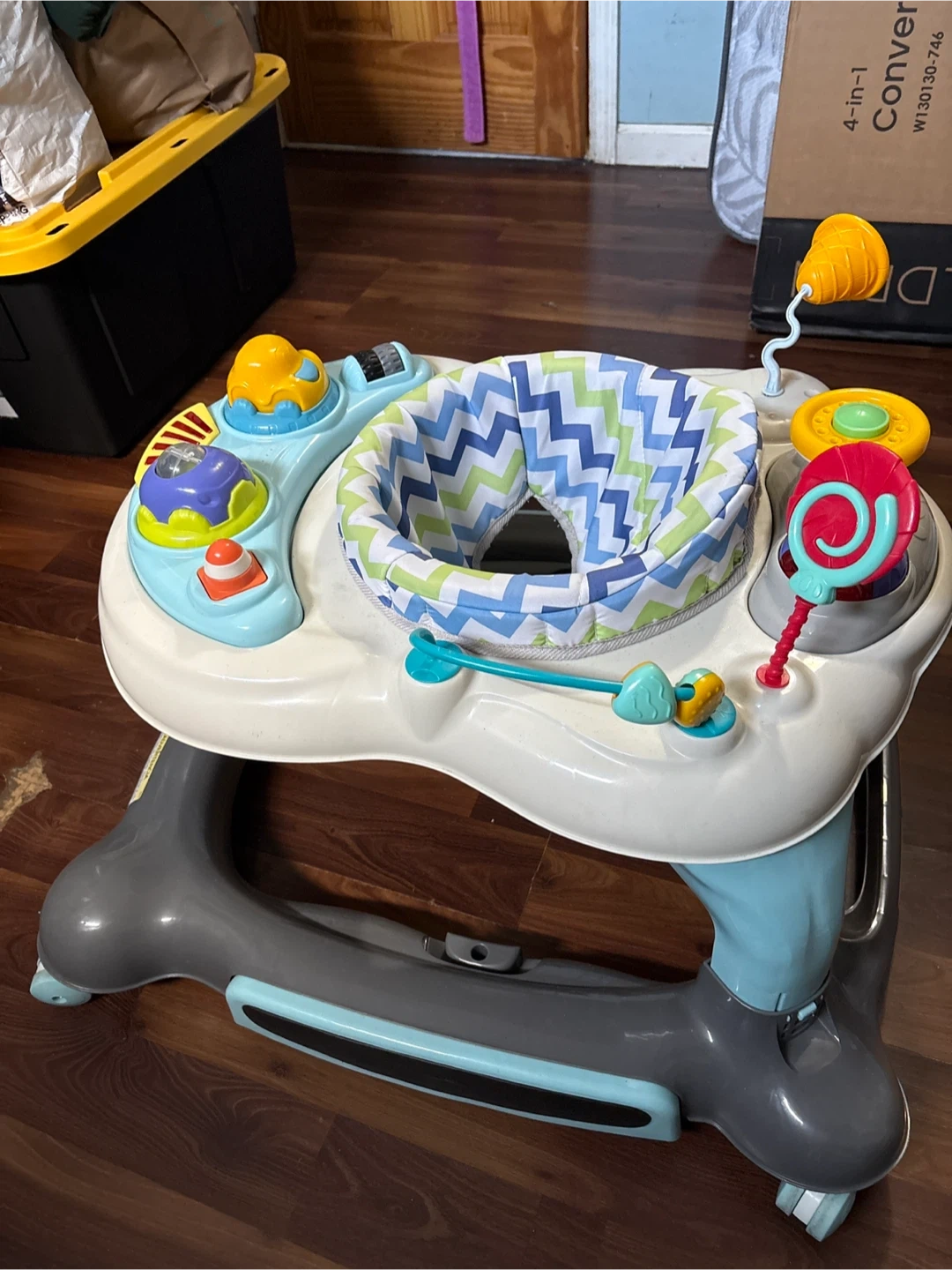 Here is a baby walker with interactive toys and a comfortable seat for your little one. It's in good condition almost new and ready for a new home!