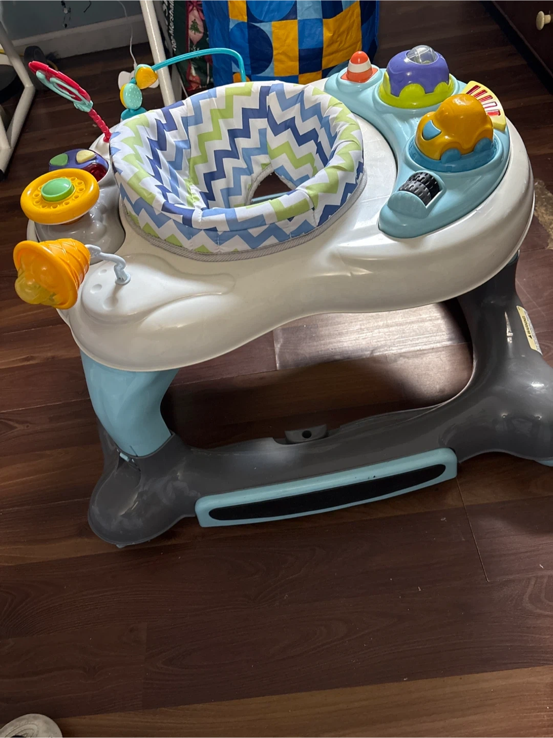 Here is a baby walker with interactive toys and a comfortable seat for your little one. It's in good condition almost new and ready for a new home!
